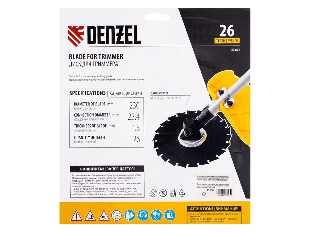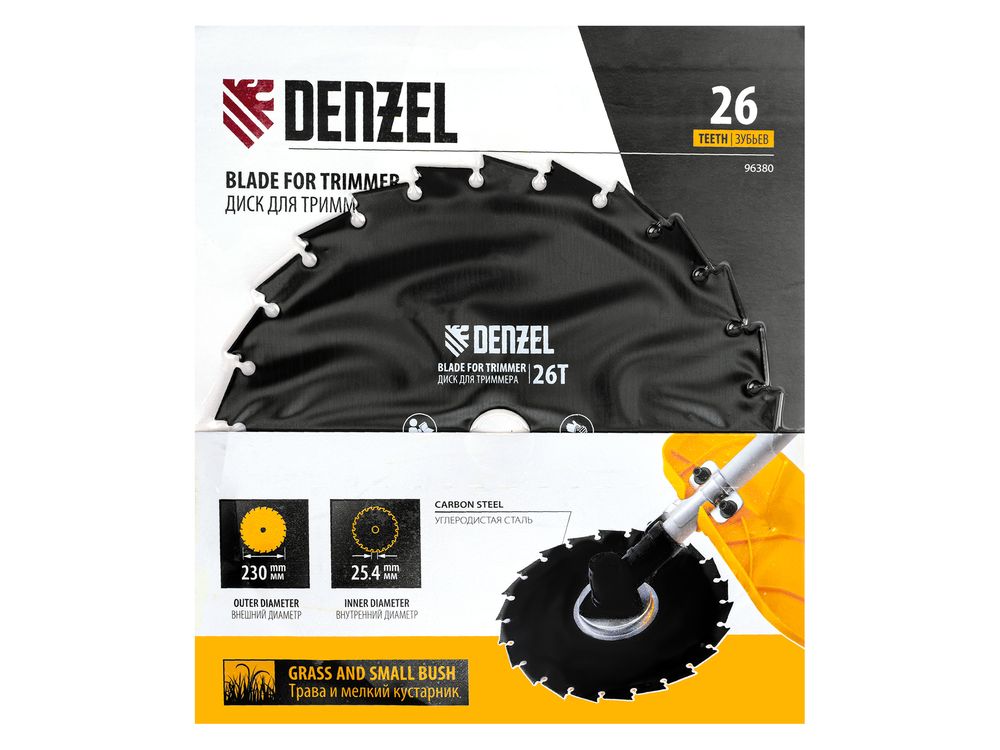 Диск для триммера Denzel 96380 с внешним диаметром 230 мм и посадочным — 25,4 мм, с 26 зубьями долотообразной формы, предназначен для скашивания травы и мелкого кустарника. Устанавливается на вал триммера с бензиновым двигателем. Диск пригодится для ухода за дачным участком.