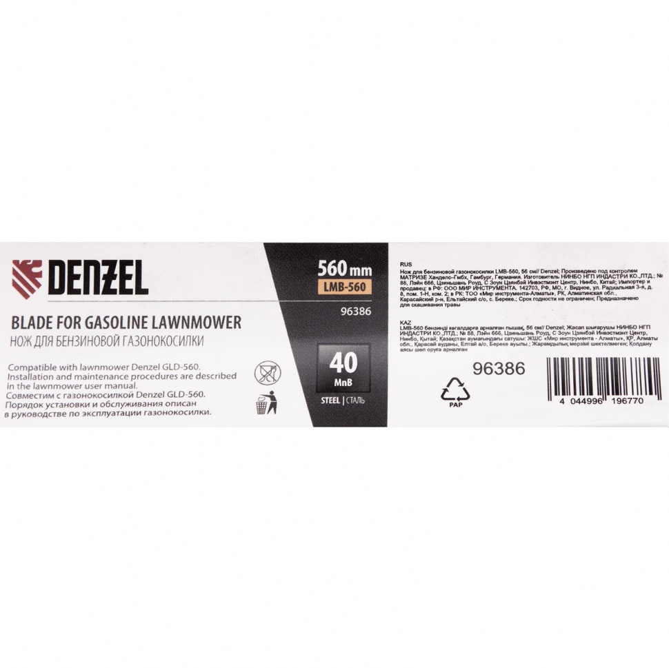 Нож Denzel 96386 длиной 56 см — сменный режущий элемент для бензиновой газонокосилки GLD-560. Используется для скашивания травы на дачных газонах, кортах, а также для ухода за садовыми и парковыми территориями. Эффективно срезает траву, пригодится владельцам дачных участков и работникам коммунальных служб.