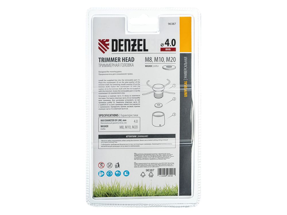 Универсальная быстрозажимная триммерная головка Denzel 96387, в комплекте с шайбами M8, M10, M20, предназначена для установки на электро- и бензотриммеры. Позволяет ухаживать за газоном и эффективно бороться с сорняками. Подходит для работы на местности со сложным рельефом. Используется для ухода за растительностью на дачном участке.