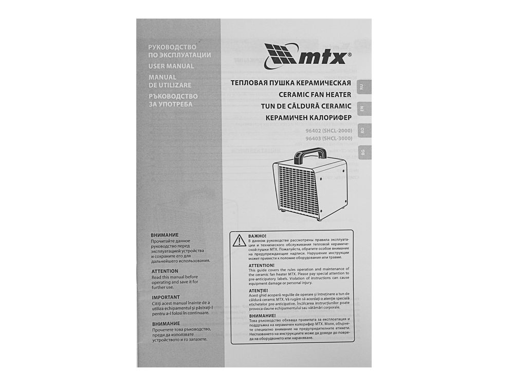 Керамическая тепловая пушка MTX SHCL-2000 96402 производительностью 125 куб. м/ч, в квадратном корпусе, работает в режиме нагрева на полной мощности 2 кВт или частичной 1 кВт, а также в режиме вентиляции. Предназначена для обогрева цехов, складов, мастерских и других нежилых помещений площадью до 20 кв. м. Также позволяет быстро просушивать различные поверхности, например, стяжки пола или оштукатуренные стены.,Отличительная черта пушки — технология PTC. Металлокерамические нагревательные элементы обладают функцией саморегуляции электрического сопротивления, что обеспечивает оптимальную температуру нагревательного элемента и пожаро-, взрывобезопасность изделия. При сохранении физической целостности нагревательный элемент не теряет своих свойств на протяжении всего срока службы.