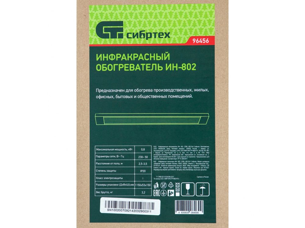 Инфракрасный обогреватель Сибртех ИН-802 96456 подключается к сети 230 В, потребляет мощность до 800 Вт и предназначен для создания комфортных температурных условий в помещении в холодное время года. Служит основным источником тепла на площади до 8 кв. м и дополнительным — в помещениях до 16 кв. м.,Одно из ключевых преимуществ обогревателя — энергоэффективность. Инфракрасное тепло передается сквозь воздух, не нагревая его, а нагревая предметы, находящиеся на расстоянии. Примерно по такому принципу на Землю передается тепло от Солнца. Вы ощутите его сразу, не дожидаясь прогрева всего воздуха в помещении.