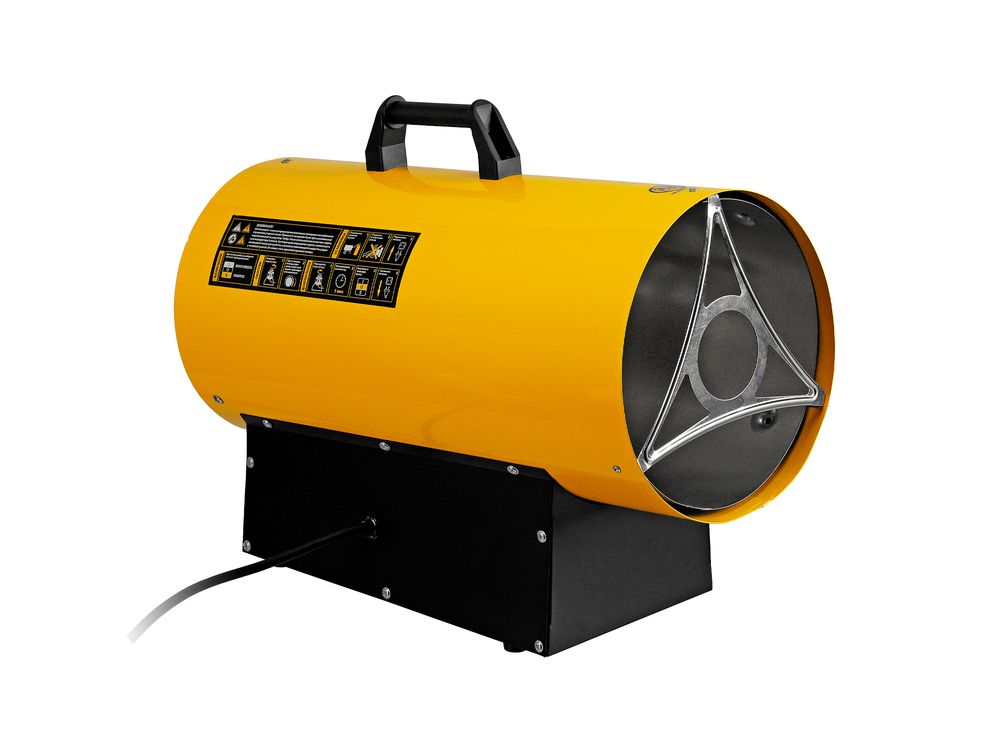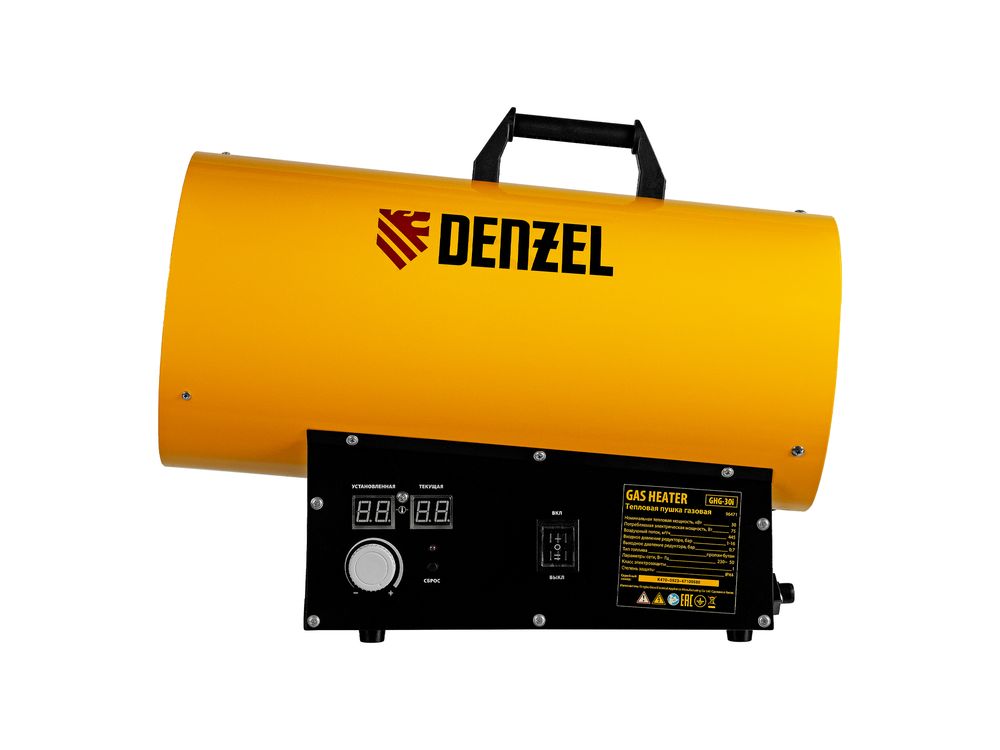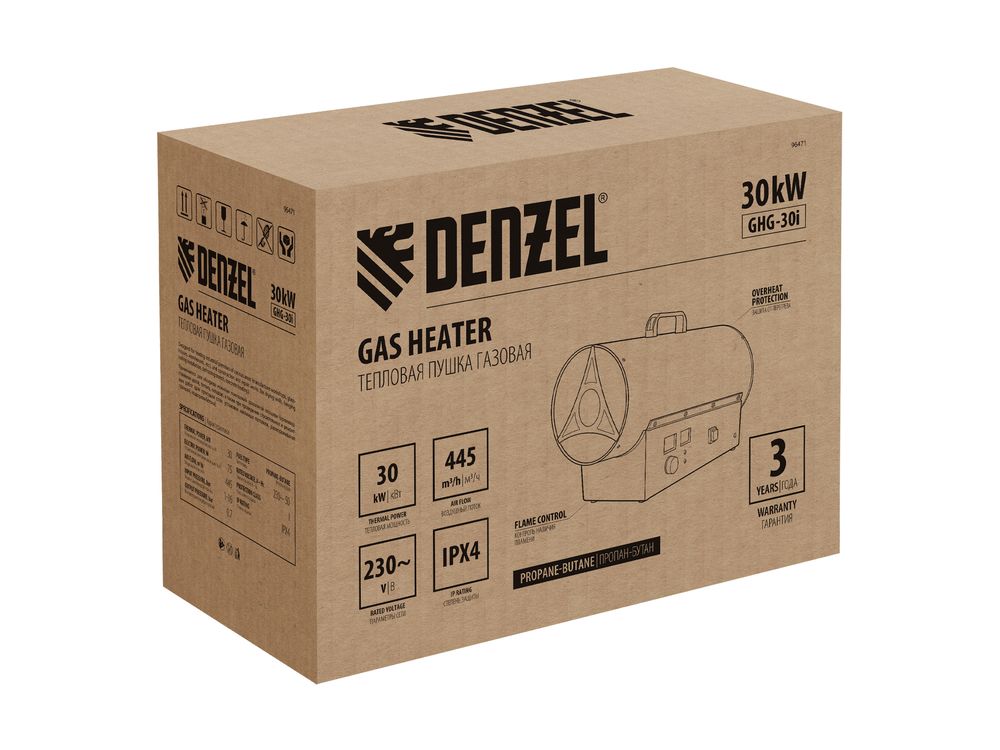 Газовая тепловая пушка Denzel GHG-30i 96471 мощностью 30 кВт, с цифровым термостатом и двойным электромагнитным клапаном, работает на сжиженном газе пропан-бутан и предназначена для обогрева хорошо вентилируемых нежилых помещений площадью до 300 кв. м: складов, цехов, гаражей, мастерских, теплиц. Генерирует воздушный поток 445 куб. м/ч, поэтому эффективно справляется с поставленными задачами. Используется на строительных и производственных объектах, для монтажа натяжных потолков.