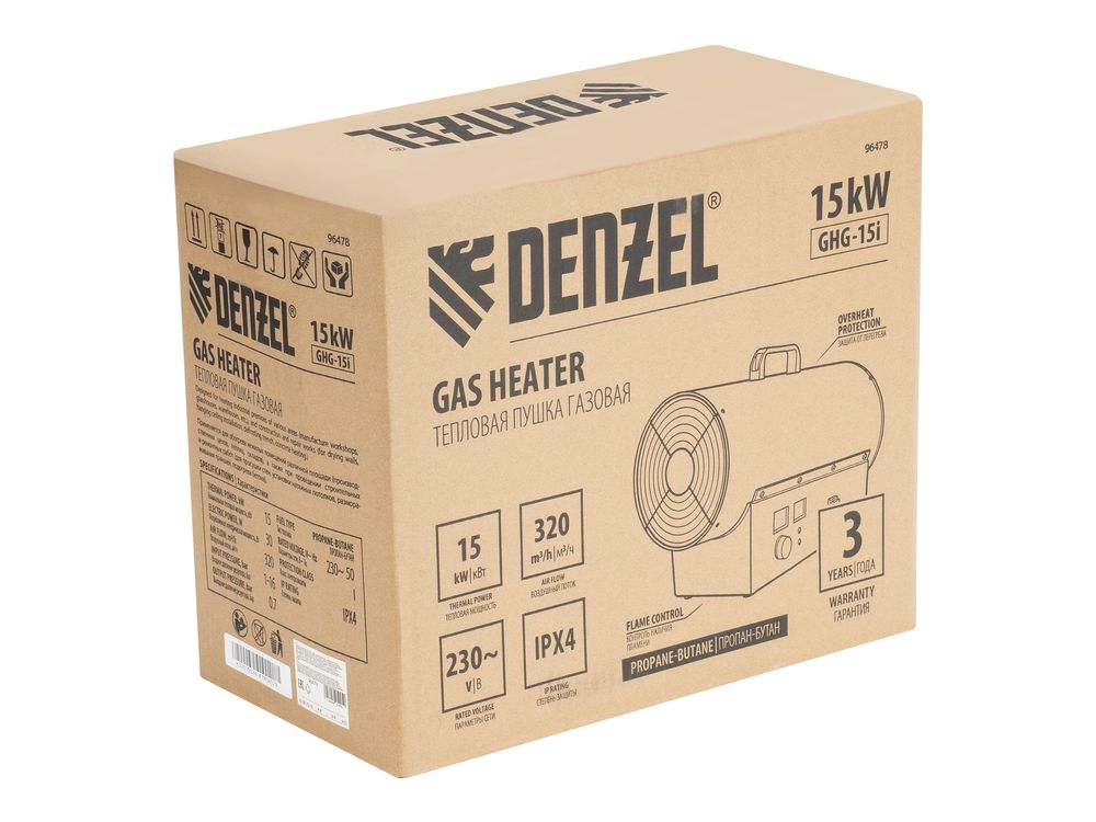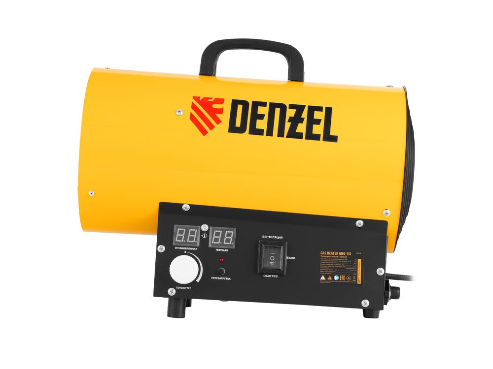 Газовая тепловая пушка Denzel GHG-15i 96478 мощностью 15 кВт, с цифровым термостатом и двойным электромагнитным клапаном, работает на сжиженном газе пропан-бутан и предназначена для обогрева хорошо вентилируемых нежилых помещений площадью до 150 кв. м: складов, цехов, гаражей, мастерских, теплиц. Генерирует воздушный поток 320 куб. м/ч, поэтому эффективно справляется с поставленными задачами. Используется на строительных и производственных объектах, для монтажа натяжных потолков.