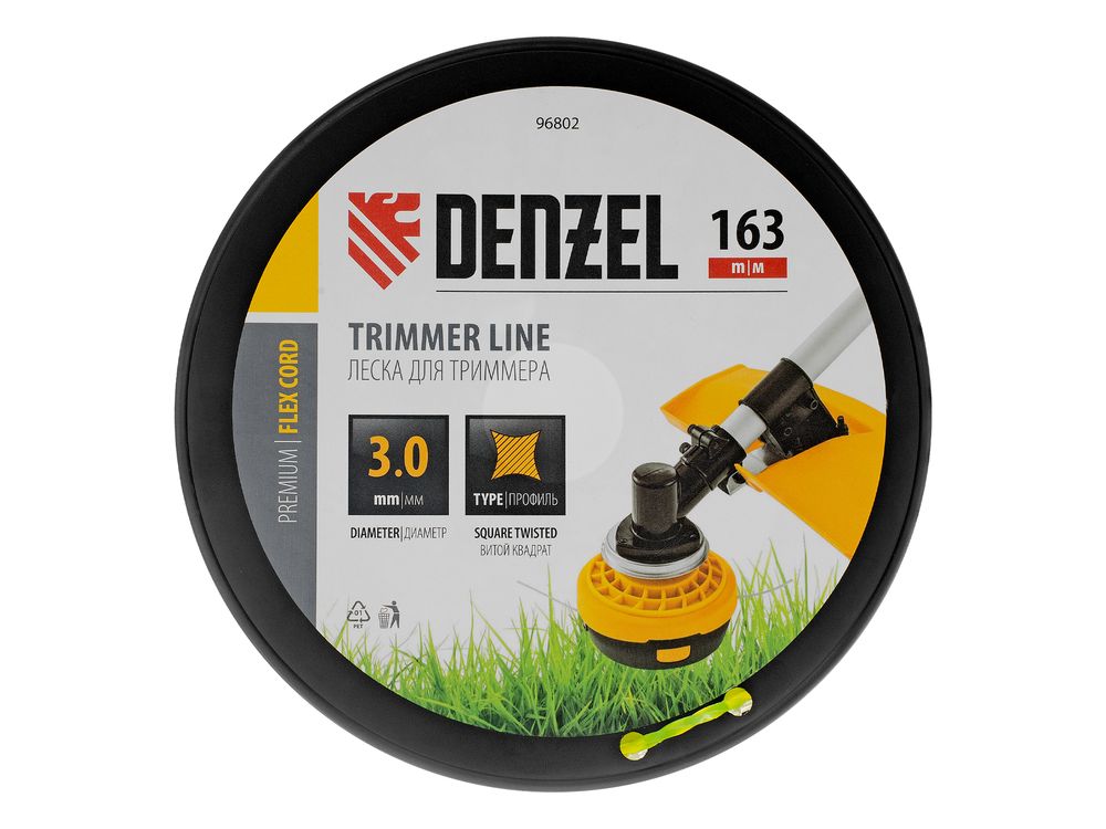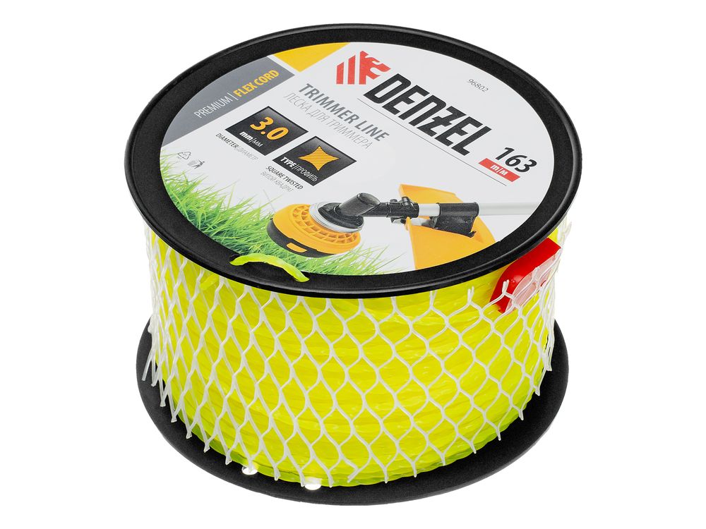 Леска для триммера Denzel FLEX CORD 96802 с сечением «витой квадрат», толщиной 3,0 мм и длиной 163 м, на DIN-катушке, предназначена для скашивания крупностеблевой растительности. Используется на бензиновых триммерах с объемом двигателя 25-52 см3 и электротриммерах мощностью от 1 до 1,5 кВт.