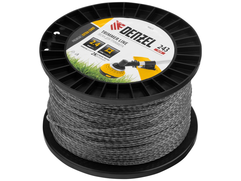 Двухкомпонентная леска для триммера Denzel EXTRA CORD 96823 размером 2,4 мм х 243 м, с сечением «витой квадрат», на DIN-катушке, используется для скашивания густых зарослей травы и сорных растений на дачном участке и придомовой территории. Предназначена для электротриммеров и бензокос с объемом двигателя 25-52 см3. Устойчива к излому, что облегчает ее заправку в катушку. Благодаря острым граням леска успешно справляется с толстыми, жесткими стеблями, позволяя быстро обработать участок большой площади.