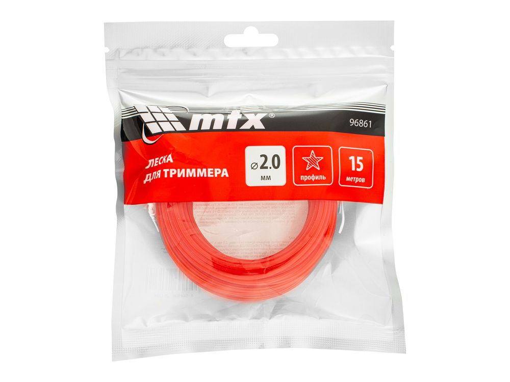 Леска для триммера MTX 96861 с сечением «звезда», толщиной 2,0 мм и длиной 15 м, подходит для скашивания как мягкой газонной, так и жесткой травы. Используется в качестве расходного материала для электрических триммеров мощностью 1000-1500 Вт. Необходима для ухода за дачным участком.