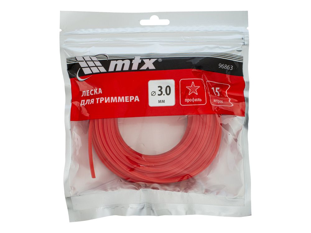Леска для триммера MTX 96863 с сечением «звезда», толщиной 3,0 мм и длиной 15 м, подходит для скашивания как мягкой газонной, так и жесткой, а также сухой травы. Может применяться для срезания побегов кустов. Используется в качестве расходного материала для бензиновых триммеров. Необходима для ухода за дачным участком, пригодится сотрудникам коммунальных служб.