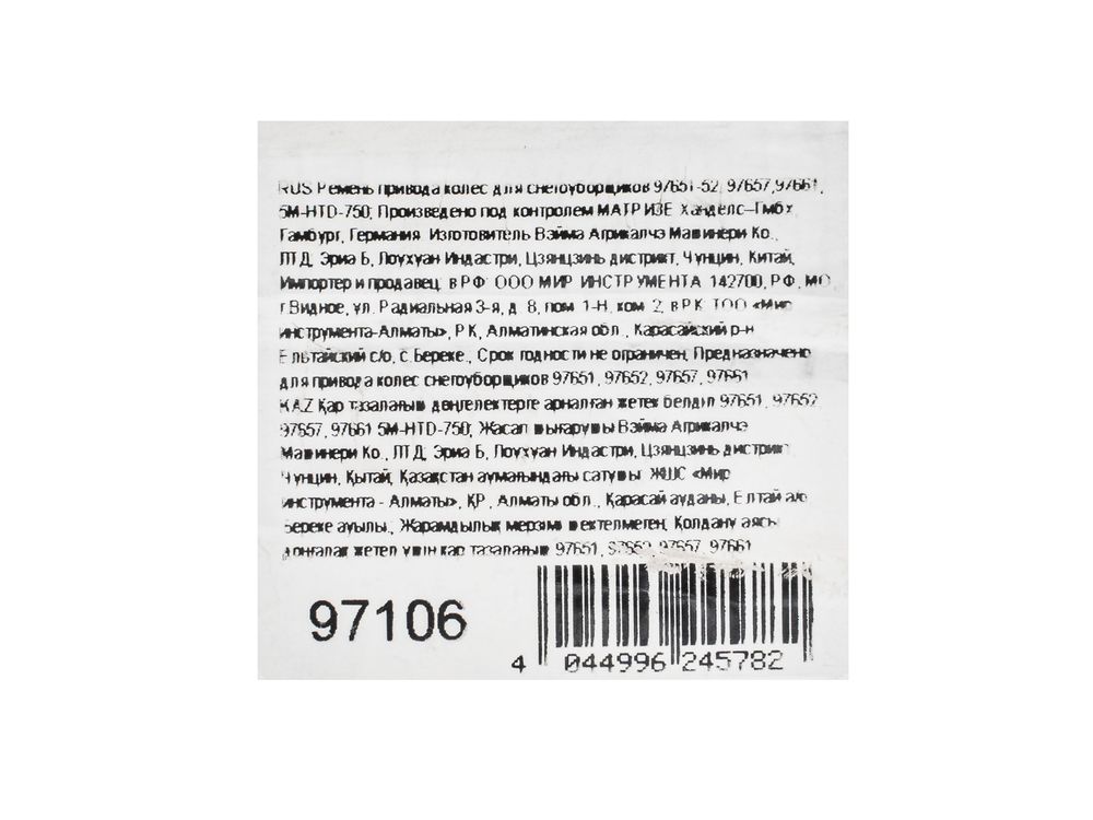 Зубчатый ремень привода шнека 5M-HTD-750 97106 используется в качестве запасного аксессуара для снегоуборочных машин SB 560 97651, SB 560 LP 97652, BM 610DT PRO 97657 и SWB-600 97661. Предназначен для передачи крутящего момента, позволяет восстановить работоспособность техники после выхода из строя старого ремня.