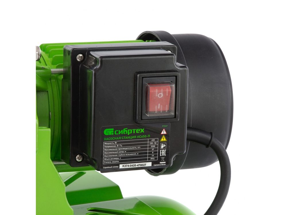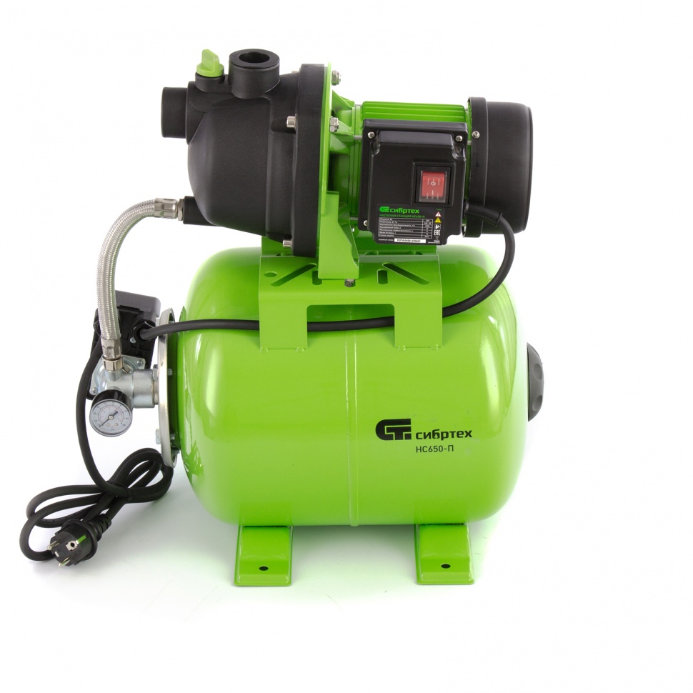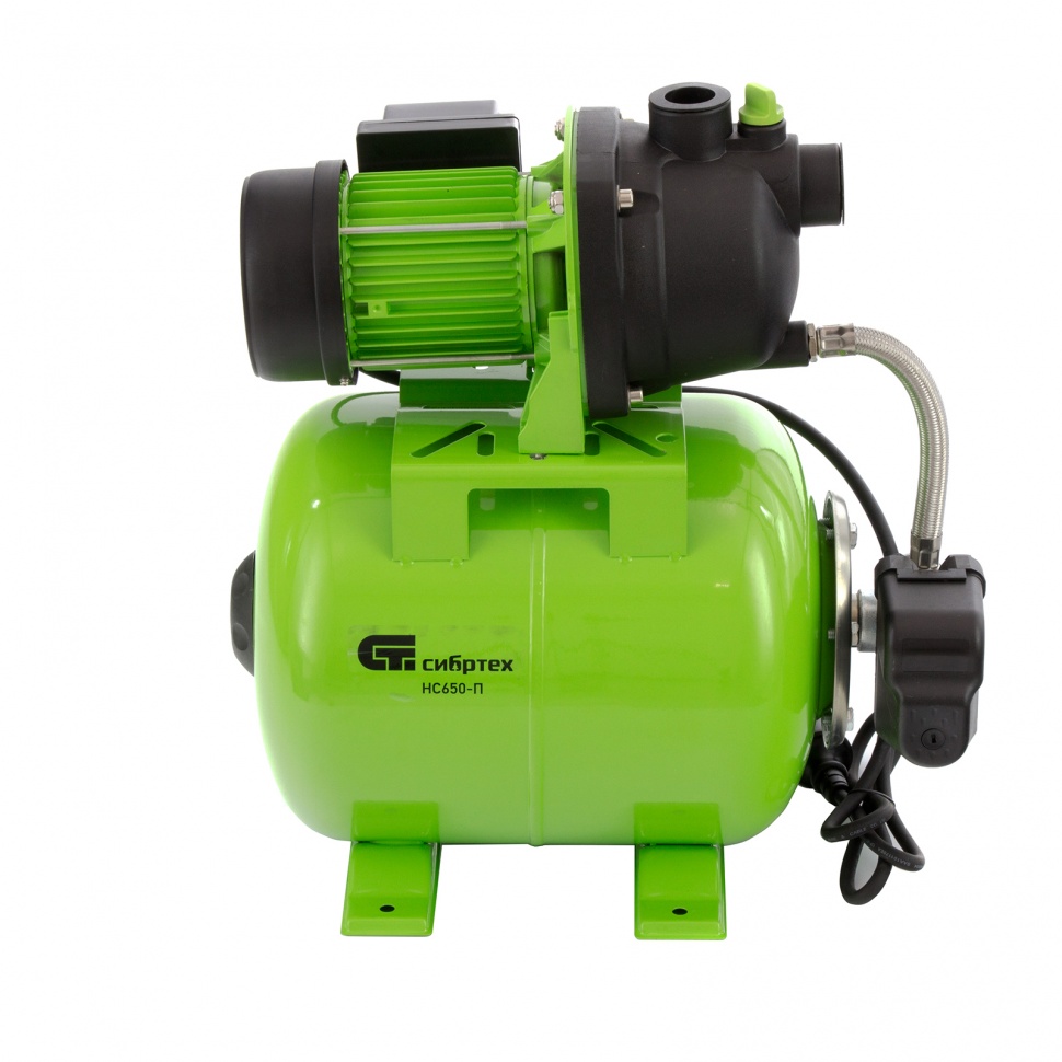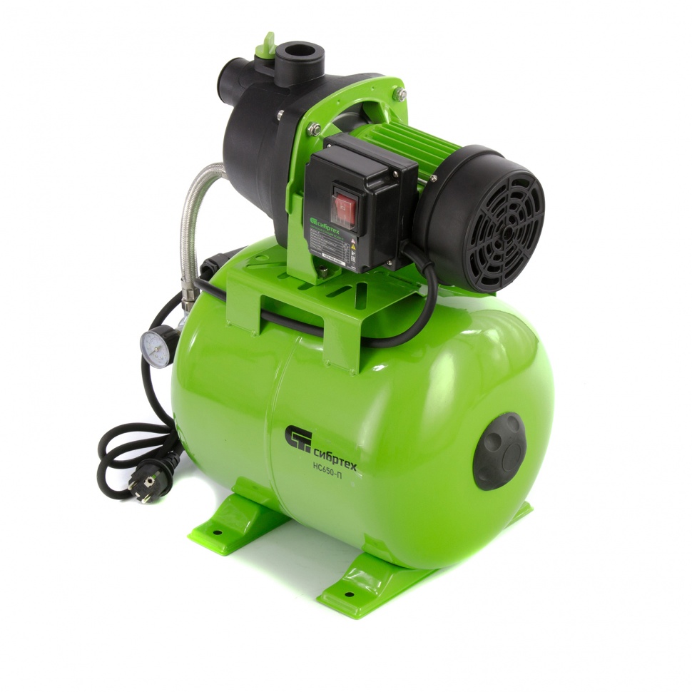 Насосная станция Сибртех НС650-П 97247 мощностью 650 Вт, с ресивером на 19 л, обеспечивает напор воды до 37 м и применяется для организации водоснабжения в частных домах и дачных коттеджах. Также подходит для стабилизации напора воды в квартирах. Надежный электродвигатель на 650 Вт обеспечивает скорость перекачивания до 53 л/мин под давлением до 2,8 бар.,Насосная станция оснащена ресивером, поэтому двигатель включается только после израсходования накопленного запаса воды. Автоматизация рабочего процесса позволяет разумно потреблять как воду, так и электроэнергию.