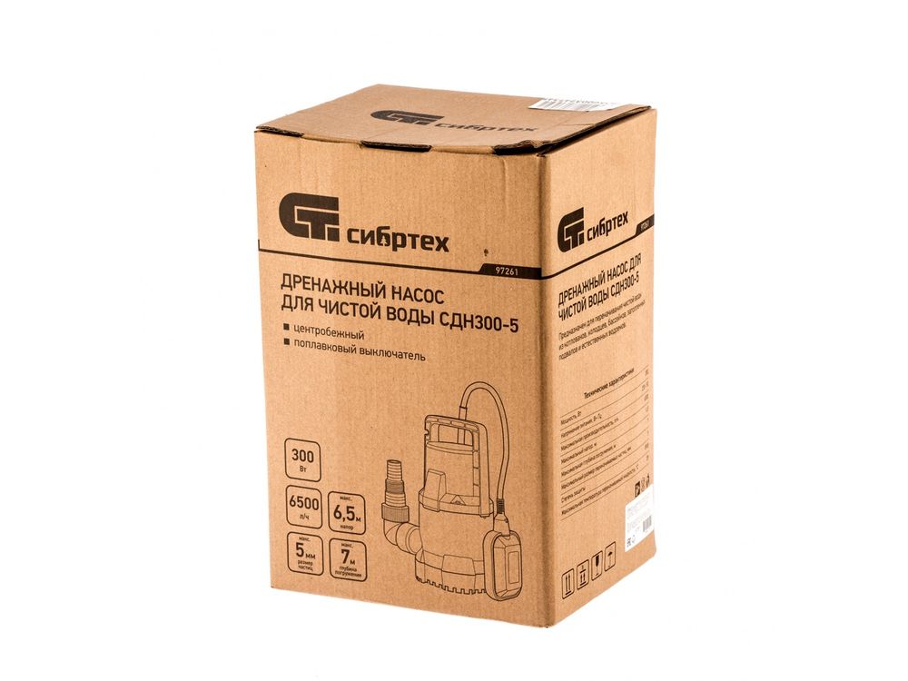Дренажный насос Сибртех СДН300-5 97261 мощностью 300 Вт и производительностью 6500 л/ч обеспечивает напор до 6,5 м и предназначен для осушения колодцев, затопленных помещений, бассейнов, а также для подачи чистой воды к системам орошения и водоснабжения. Допускается наличие твердых частиц размером до 5 мм в перекачиваемой воде. Насос питается от однофазной сети с напряжением 230 В, поэтому подходит для применения в частных домах, дачных коттеджах и на небольших строительных объектах