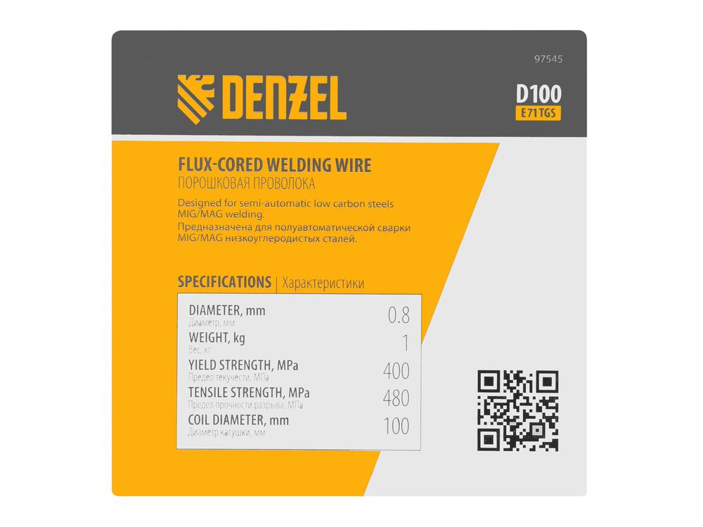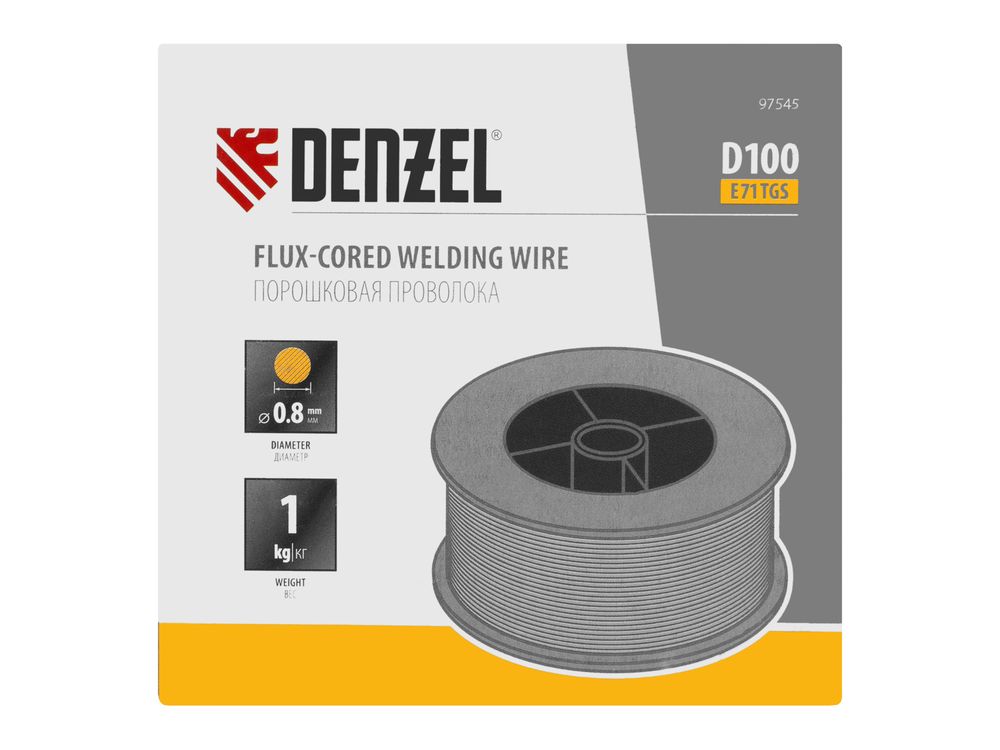 Порошковая проволока Denzel E71TGS 97545 диаметром 0,8 мм и весом 1 кг, на катушке типа D100, предназначена для полуавтоматической сварки MIG/MAG углеродистых и низколегированных сталей без среды защитных газов. Необходима профессиональным сварщикам, пригодится также частному мастеру.