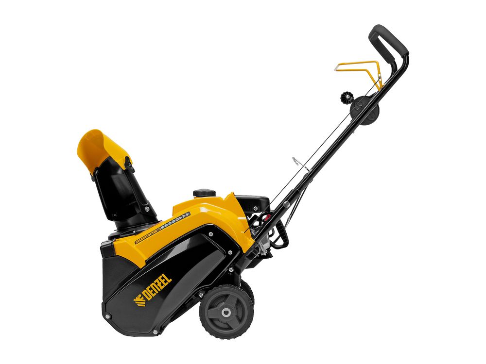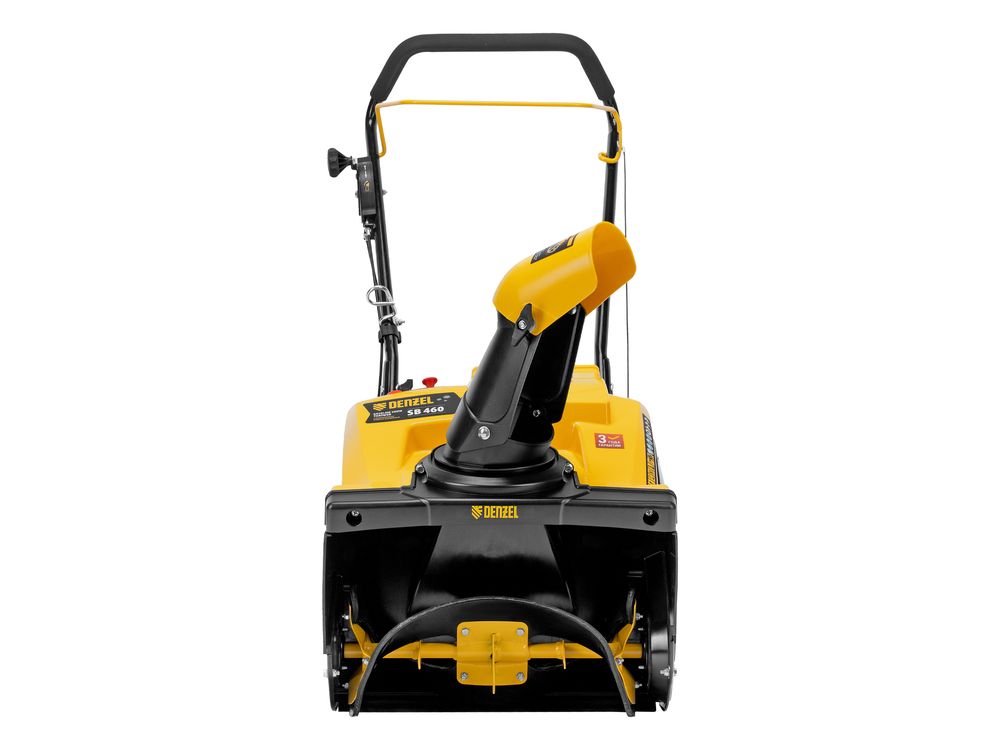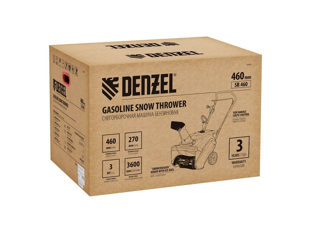 Бензиновая снегоуборочная машина Denzel SB 460 97650 с двигателем объемом 99 см3, ручным стартом и эксклюзивным шнеком Snow Crusher, предназначена для очищения от снега открытых ровных поверхностей: придомовой территории, дорожек, тротуаров, автомобильных парковок. Высота захвата составляет 27 см, ширина — 46 см, дальность выброса снега достигает 10 м. Машина значительно превосходит в производительности электрические модели, оставаясь компактной и мобильной.