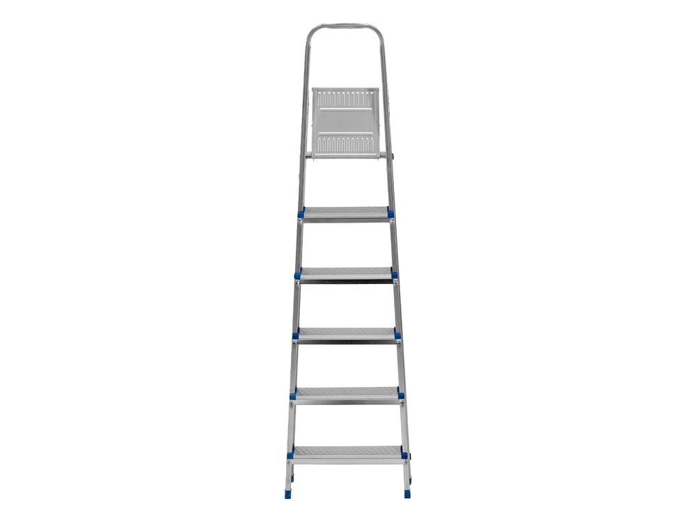 Стальная оцинкованная стремянка Сибртех 97838 с 6 ступенями позволяет повесить полку, картину или шкафчик, достать нужный предмет и решить другие задачи, для которых требуется доступ к предметам на высоте. Рама и ступени из стального профиля выдерживают вес до 120 кг. Расстояние от опорной поверхности до площадки составляет 121 см, при среднем росте пользователя 170 см рабочая высота лестницы — 321 см. Необходимо соблюдать технику безопасности: размещать стремянку только на ровной плоскости и не использовать ее для работы с дрелью, шуруповертом и другим электроинструментом.
