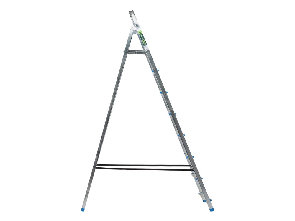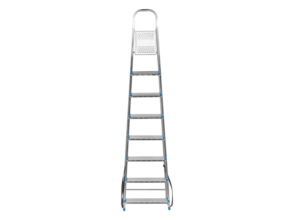 Стальная оцинкованная стремянка Сибртех 97840 с 8 ступенями позволяет выполнять ремонтные и садовые работы, для которых требуется доступ к предметам на высоте. Рама и ступени из стального профиля выдерживают вес до 120 кг. Расстояние от опорной поверхности до площадки составляет 166 см, при среднем росте пользователя 170 см рабочая высота лестницы — 366 см. Необходимо соблюдать технику безопасности: размещать стремянку только на ровной плоскости и не использовать ее для работы с дрелью, шуруповертом и другим электроинструментом.