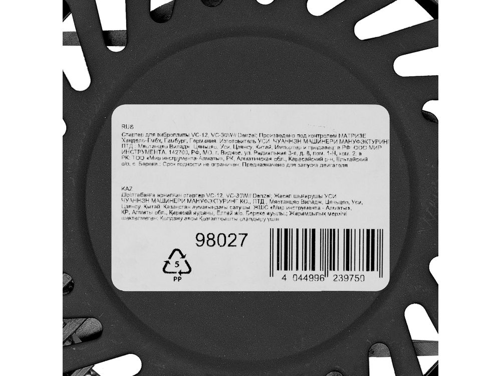 Стартер Denzel 98027 — пусковой механизм для виброплит Denzel VC-12 и VC-30W. Обеспечивает быстрый запуск двигателя. Предназначен для замены вышедшего из строя узла.