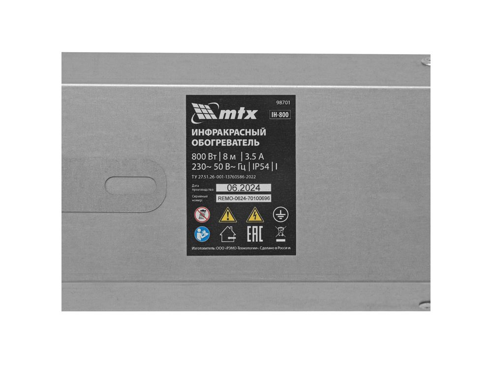 Инфракрасный обогреватель MTX IH-800 98701 подключается к сети 230 В, потребляет мощность до 800 Вт, защищен по стандарту IP54 и оснащен кабелем длиной 1,8 м с вилкой. Предназначен для обогрева помещений, благодаря высокой степени защиты IP54 не боится влаги, поэтому может быть установлен на улице под открытым небом, на открытых верандах, в беседках, курятниках, теплицах и подвальных помещениях, часто используется для сушки деревянных поверхностей. Служит основным источником тепла на площади до 8 м2 и дополнительным — в помещениях до 16 м2. Произведен в России. Инфракрасное излучение проходит сквозь воздух и обогревает предметы, стены и пол помещения, от которых, в свою очередь, нагревается воздух. Нагретый воздух, поднимаясь к потолку, постепенно остывает, при этом на уровне головы стоящего человека температура воздуха оказывается на 1-2 °С ниже температуры пола. В отличие от систем конвективного отопления (тепловентиляторов, электрорадиаторов, конвекторов, стационарных батарей), при использовании которых сначала нагревается воздух по всему объему помещения, а от него предметы и тела, находящиеся в нем, лучистое отопление, подобно естественному солнечному теплу, нагревает сначала предметы. Специальная рифленая поверхность повышает эффективность инфракрасного обогрева. Преимущества- Безопасность — благодаря оптимальной длине волны 5,9 мкм обогреватель не наносит вреда здоровью.
