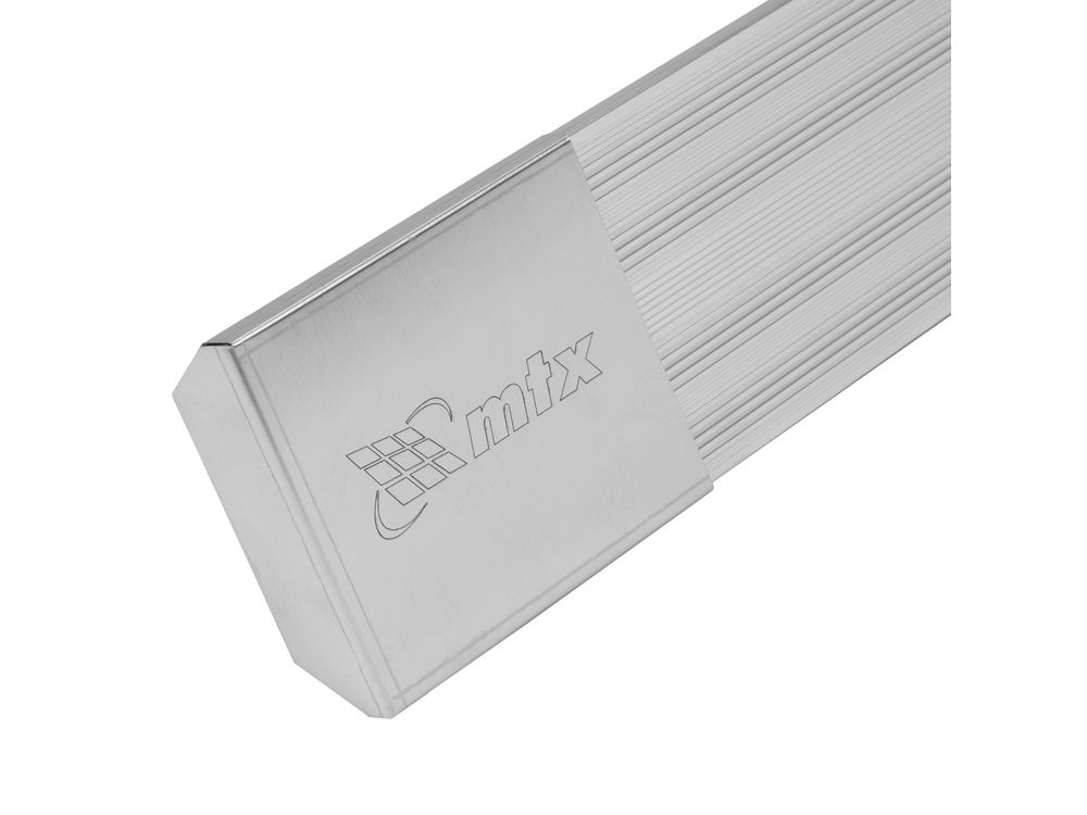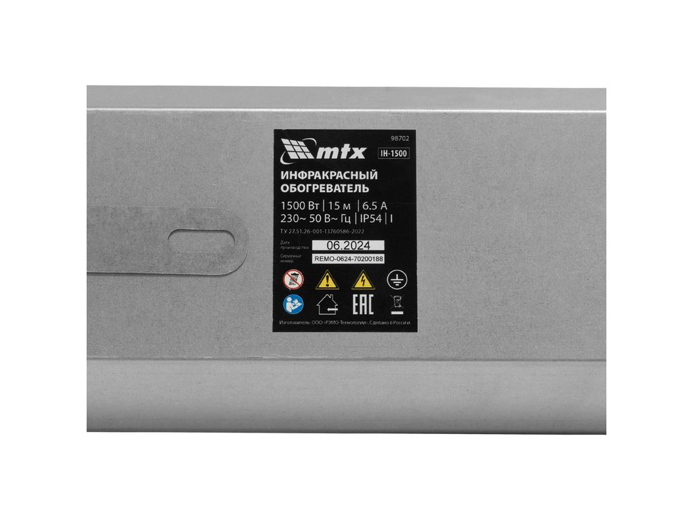 Инфракрасный обогреватель MTX IH-1500 98702 подключается к сети 230 В, потребляет мощность до 1500 Вт, защищен по стандарту IP54 и оснащен кабелем длиной 1,8 м с вилкой. Предназначен для обогрева помещений, благодаря высокой степени защиты IP54 не боится влаги, поэтому может быть установлен на улице под открытым небом, на открытых верандах, в беседках, курятниках, теплицах и подвальных помещениях, часто используется для сушки деревянных поверхностей. Служит основным источником тепла на площади до 15 м2 и дополнительным — в помещениях до 30 м2. Произведен в России. Инфракрасное излучение проходит сквозь воздух и обогревает предметы, стены и пол помещения, от которых, в свою очередь, нагревается воздух. Нагретый воздух, поднимаясь к потолку, постепенно остывает, при этом на уровне головы стоящего человека температура воздуха оказывается на 1-2 °С ниже температуры пола. В отличие от систем конвективного отопления (тепловентиляторов, электрорадиаторов, конвекторов, стационарных батарей), при использовании которых сначала нагревается воздух по всему объему помещения, а от него предметы и тела, находящиеся в нем, лучистое отопление, подобно естественному солнечному теплу, нагревает сначала предметы. Специальная рифленая поверхность повышает эффективность инфракрасного обогрева. Преимущества- Безопасность — благодаря оптимальной длине волны 5,9 мкм обогреватель не наносит вреда здоровью.
