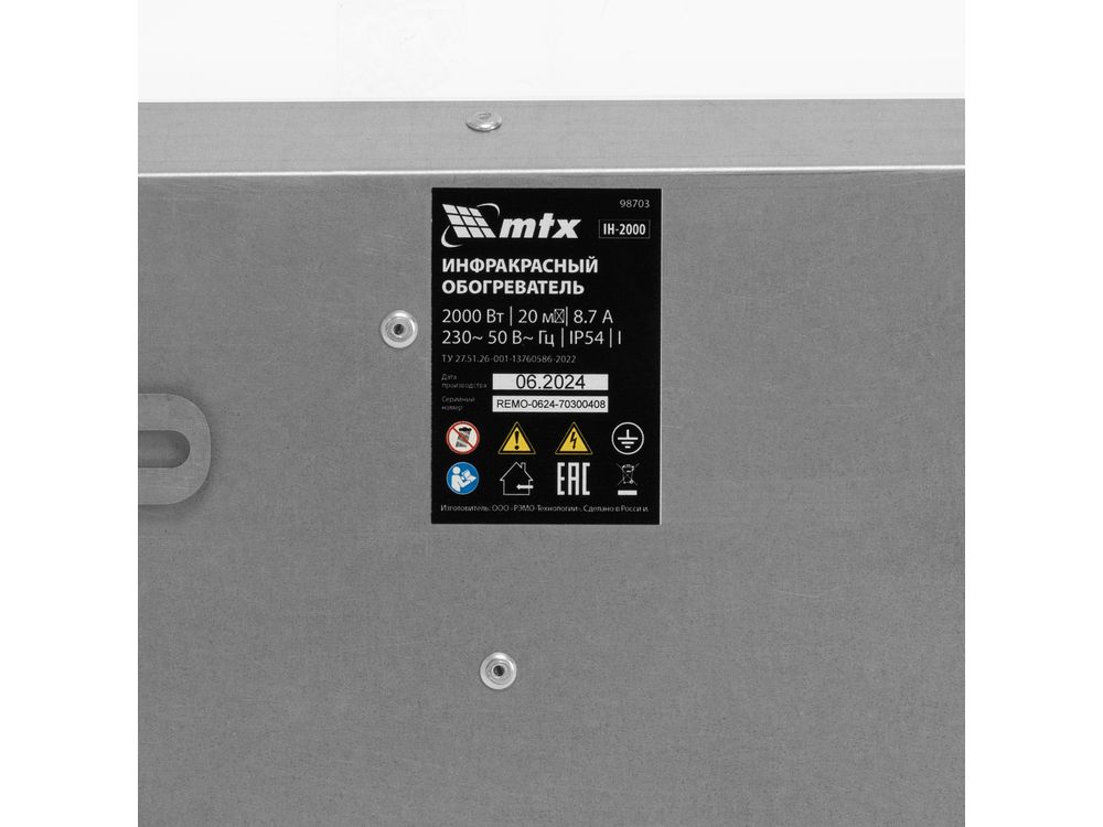 Инфракрасный обогреватель MTX IH-2000 98703 подключается к сети 230 В, потребляет мощность до 2000 Вт, защищен по стандарту IP54 и оснащен кабелем длиной 1,8 м с вилкой. Предназначен для обогрева помещений, благодаря высокой степени защиты IP54 не боится влаги, поэтому может быть установлен на улице под открытым небом, на открытых верандах, в беседках, курятниках, теплицах и подвальных помещениях, часто используется для сушки деревянных поверхностей. Служит основным источником тепла на площади до 20 м2 и дополнительным — в помещениях до 40 м2. Произведен в России. Инфракрасное излучение проходит сквозь воздух и обогревает предметы, стены и пол помещения, от которых, в свою очередь, нагревается воздух. Нагретый воздух, поднимаясь к потолку, постепенно остывает, при этом на уровне головы стоящего человека температура воздуха оказывается на 1-2 °С ниже температуры пола. В отличие от систем конвективного отопления (тепловентиляторов, электрорадиаторов, конвекторов, стационарных батарей), при использовании которых сначала нагревается воздух по всему объему помещения, а от него предметы и тела, находящиеся в нем, лучистое отопление, подобно естественному солнечному теплу, нагревает сначала предметы. Специальная рифленая поверхность повышает эффективность инфракрасного обогрева. Преимущества- Безопасность — благодаря оптимальной длине волны 5,9 мкм обогреватель не наносит вреда здоровью.