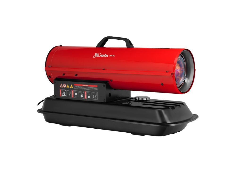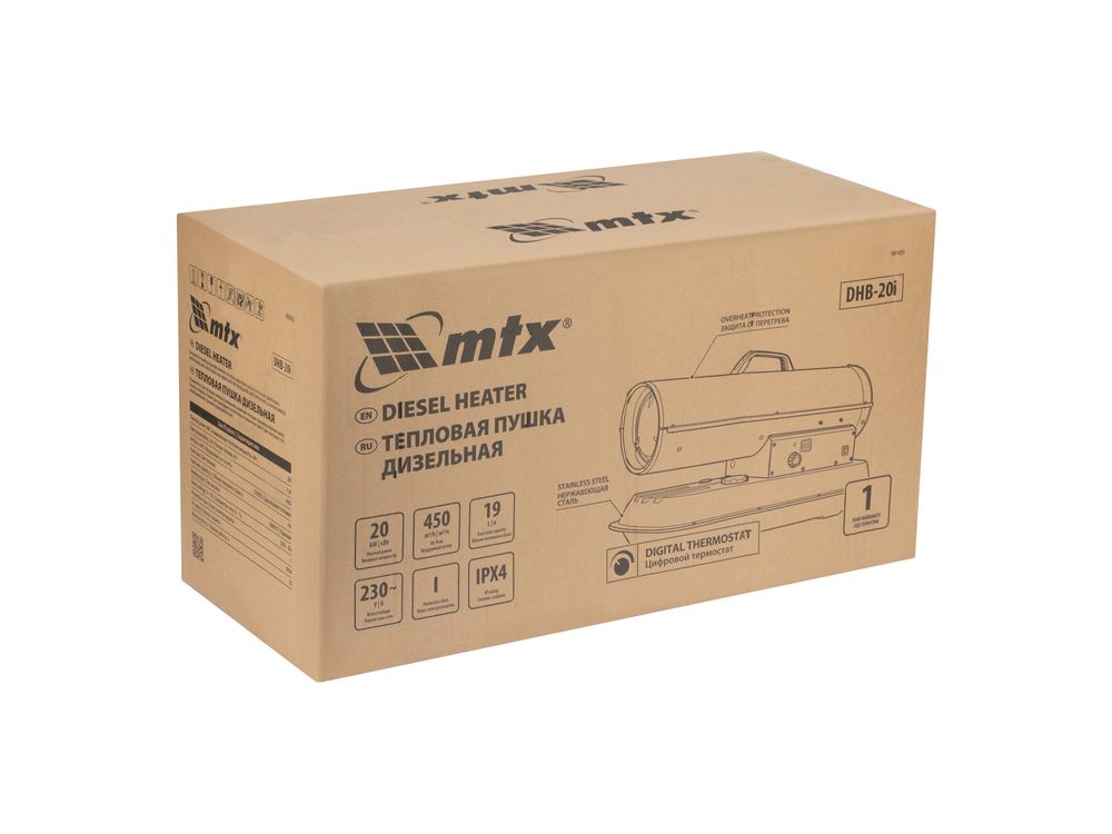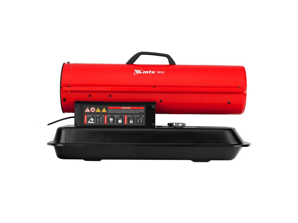 Дизельная тепловая пушка MTX DHB-20i 98905 номинальной тепловой мощностью 20 кВт и производительностью 450 м3/ч, с прямым типом нагрева и термостатом, предназначена для обогрева складов, цехов, теплиц и других нежилых помещений. Также используется на производстве и в строительстве: для прогрева бетона, просушки стен и разморозки траншей.