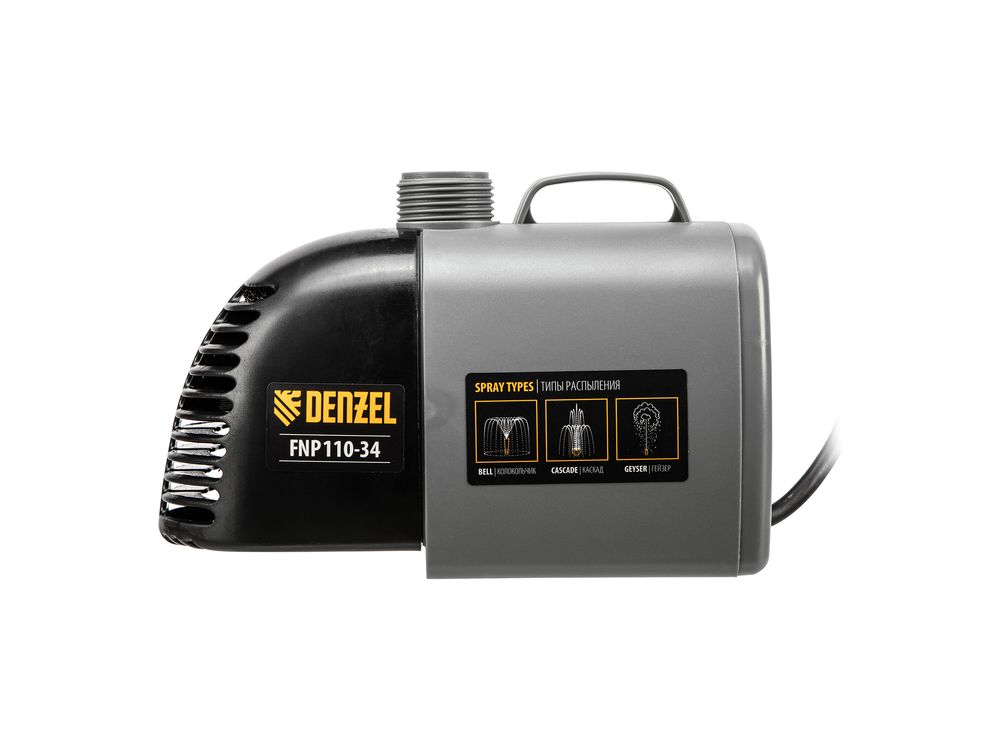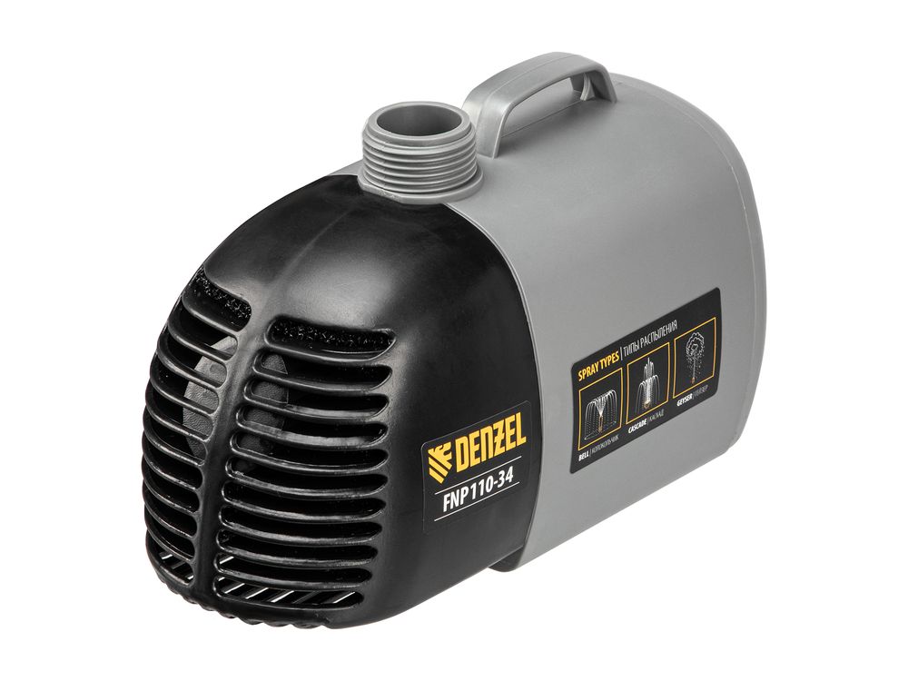 Фонтанный насос Denzel FNP110-34 99032 мощностью 112 Вт, с насадками колокольчик/каскад/гейзер, перекачивает 3400 л воды в час и обеспечивает максимальную высоту подъема 3,4 м. Позволяет создать декоративный фонтан, украсив водоем и оживив ландшафт дачного участка. Установив одну из входящих в комплект насадок, можно получить наиболее подходящий тип струи: в виде колокольчика, каскада или гейзера. Также в конструкции насоса предусмотрен специальный патрубок для создания водопада.