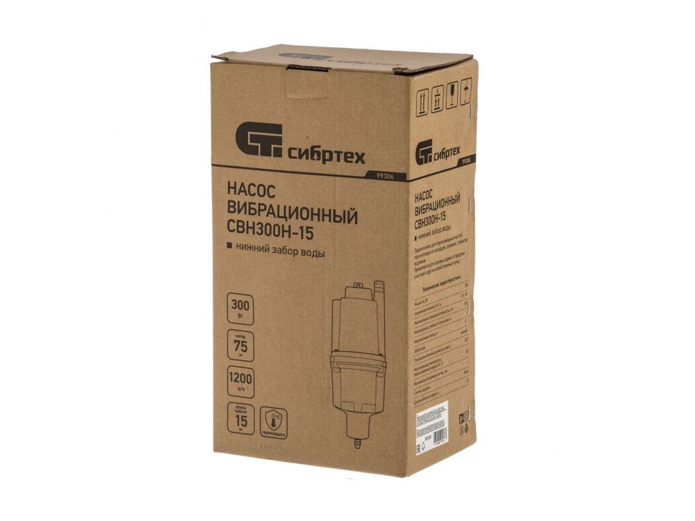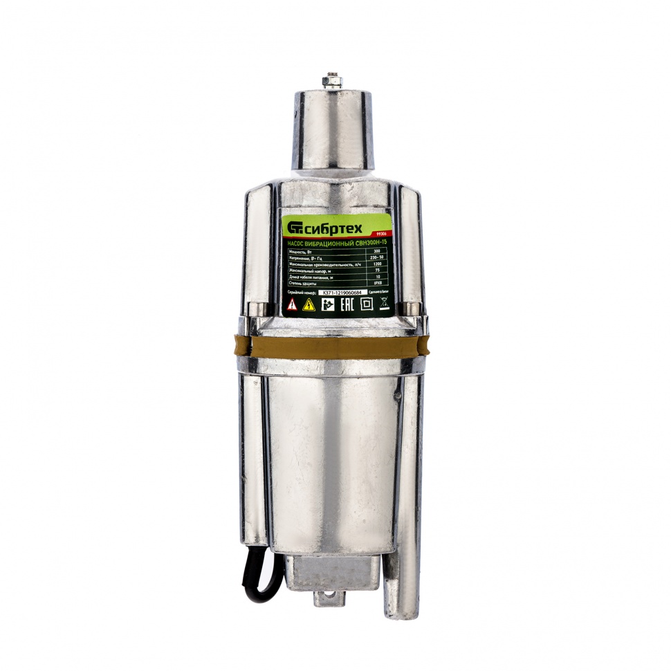Вибрационный насос Сибртех СВН300Н-15 99306 с кабелем длиной 15 м имеет мощность 300 Вт и производительность до 1200 л/ч, обеспечивает напор до 75 м и используется при откачке воды из резервуаров и скважин диаметром от 100 мм. С его помощью можно организовать систему орошения и водоснабжения на даче, а также осушить затопленное помещение. Благодаря увеличенной высоте подъема насос можно использовать в доме с несколькими этажами.