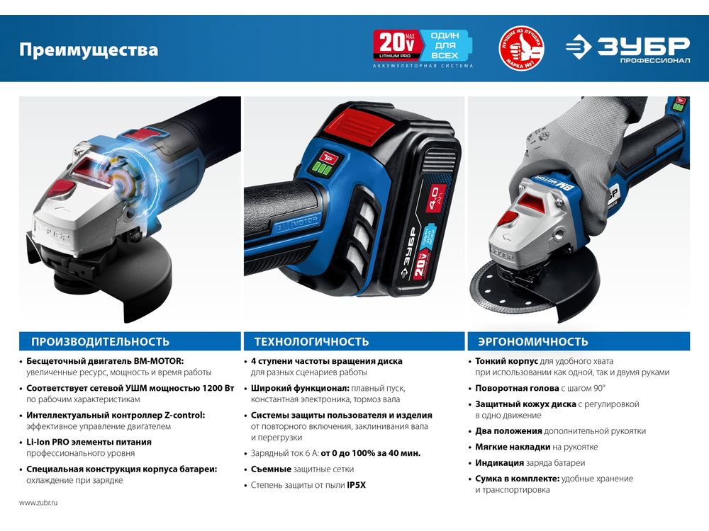 Высокотехнологичная замена сетевой УШМ мощностью до 1200 Вт. Мощная батарея емкостью 4 Ач и быстрая зарядка током 6А уменьшают простои. При меньшем, чем у сетевого аналога, весе данная модель обладает максимальной мобильностью, гораздо более удобной эргономикой, имеет все вспомогательные и защитные системы. Что в совокупности с бесщеточным двигателем с длительным ресурсом делает данную модель гораздо более выгодным выбором к приобретению