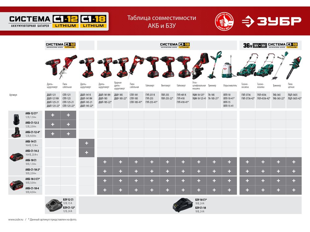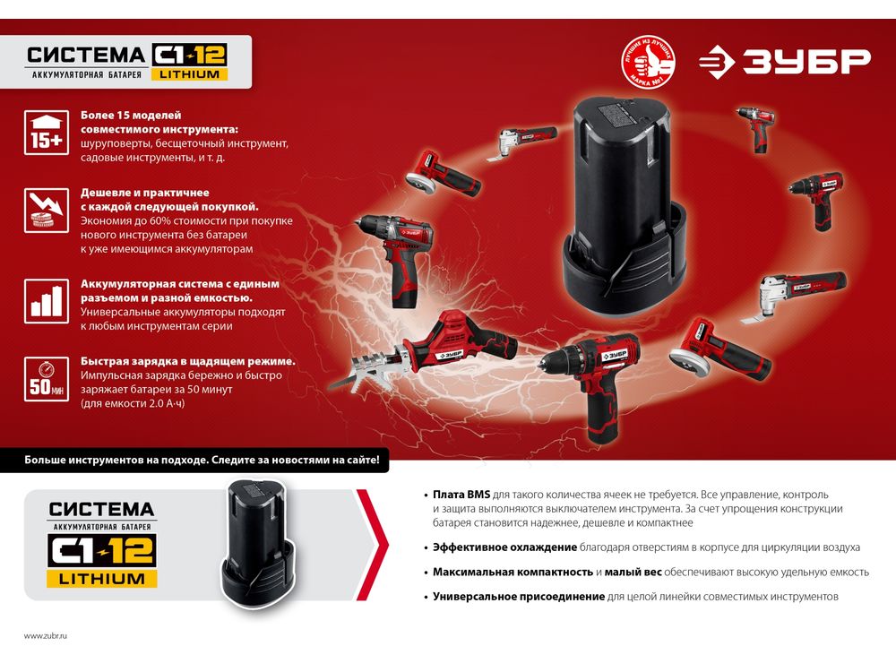 Литий-ионная технология ЗУБР нового поколения: - увеличение производительности на 35%, - электронная система защиты от перегрузки, перегрева и глубокой разрядки, - отсутствие эффекта памяти, - отсутствие потери мощности в процессе работы