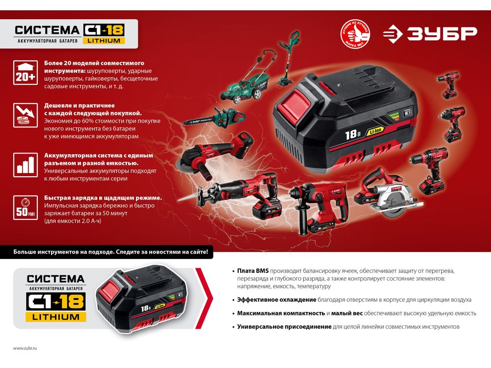 Литий-ионная технология ЗУБР нового поколения: - увеличение производительности на 35%, - электронная система защиты от перегрузки, перегрева и глубокой разрядки, - отсутствие эффекта памяти, - отсутствие потери мощности в процессе работы
