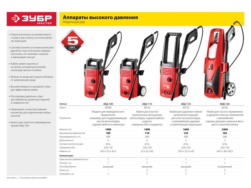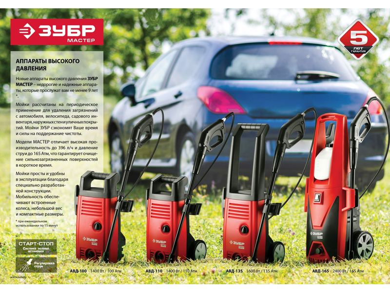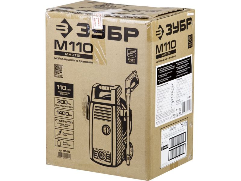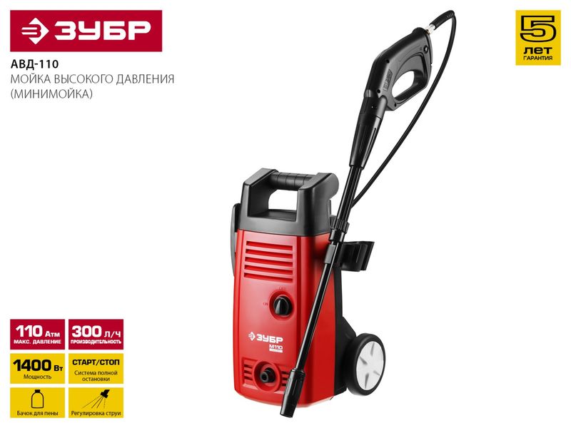 Мойка высокого давления (минимойка) ЗУБР "МАСТЕР" электрическая, макс. 110 Атм, 300 л/ч, 1400 Вт, колеса, АКВА-СТОП функция, пистолет 375