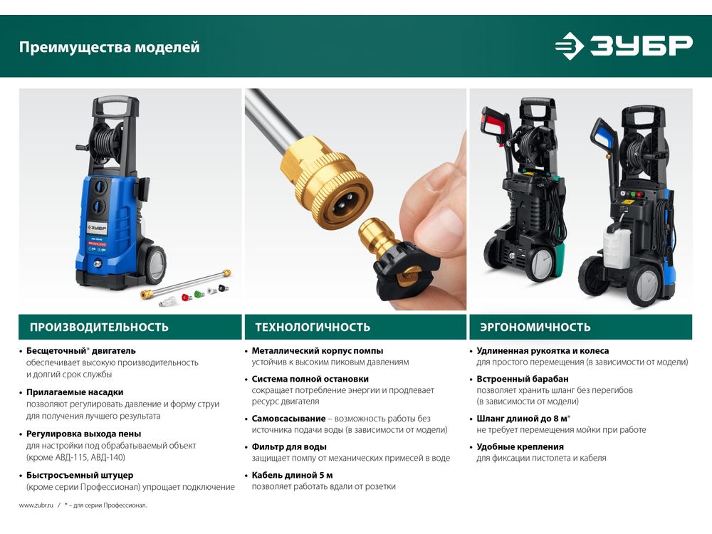 Мощное изделие для удаления любых загрязнений при помощи струи воды высокого давления. Благодаря системе полной остановки, помпа не работает при ненажатом пистолете – это экономит воду и ресурс изделия при неизбежных паузах в работе. Элегантный дизайн и удобная конструкция с держателями для аксессуаров делают работу с изделием комфортной. Регулировка выходной струи позволяет обрабатывать различные поверхности - автомобили, стены, велосипеды, напольные покрытия и т.п.