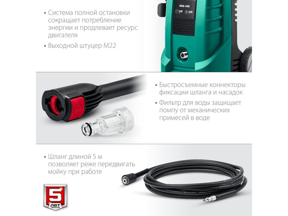 Мощное изделие для удаления любых загрязнений при помощи струи воды высокого давления. Благодаря системе полной остановки, помпа не работает при ненажатом пистолете – это экономит воду и ресурс изделия при неизбежных паузах в работе. Элегантный дизайн и удобная конструкция с держателями для аксессуаров делают работу с изделием комфортной. Регулировка выходной струи позволяет обрабатывать различные поверхности - автомобили, стены, велосипеды, напольные покрытия и т.п.