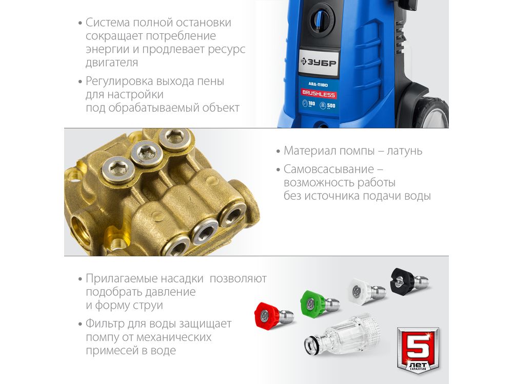 Система полной остановки выключает двигатель при отпускании клавиши пистолета, что экономит энергию и увеличивает ресурс помпы