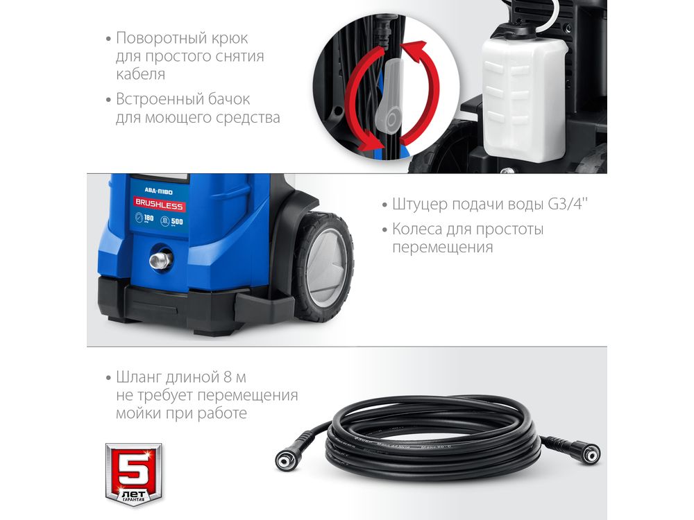 Шланг длиной 8 м позволяет производить обработку без необходимости перемещать мойку