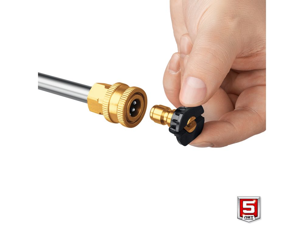 Сменные быстросъемные насадки с различными углами распыления для формирования струи различного давления, а также нанесения моющего средства: - красная - угол распыления 0 градусов, - зеленая - угол распыления 25 градусов, - белая - угол распыления 40 градусов, - черная - для нанесения моющего средства