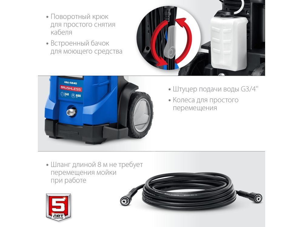 Шланг длиной 8 м позволяет производить обработку без необходимости перемещать мойку