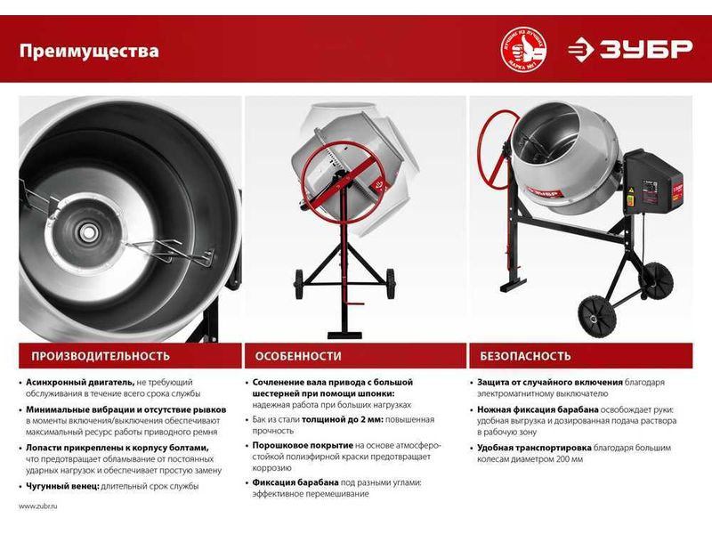 Эффективный инструмент , вместительным барабаном, удобным регулятором угла наклона барабана и надежным чугунным венцом в передаче является незаменимым помощником в строительных работах в быту и на стройплощадке. Сделано в России.