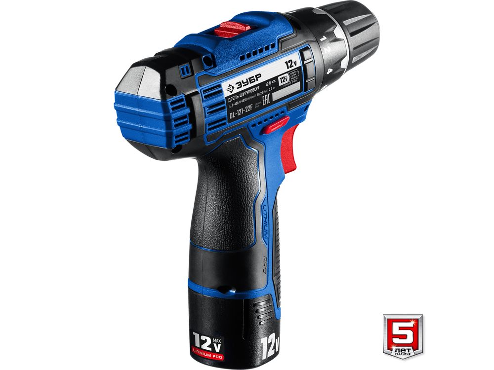 ЗУБР 12В + LED фонарь, 2 АКБ (2Ач), в кейсе, дрель-шуруповерт, Профессионал. DL-121-22F