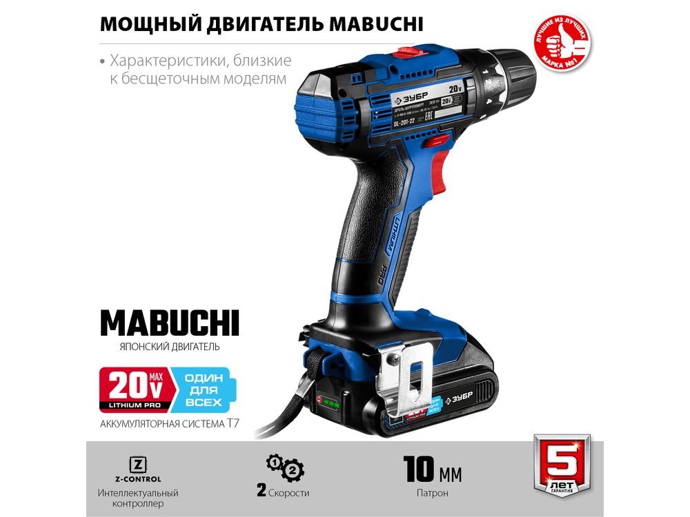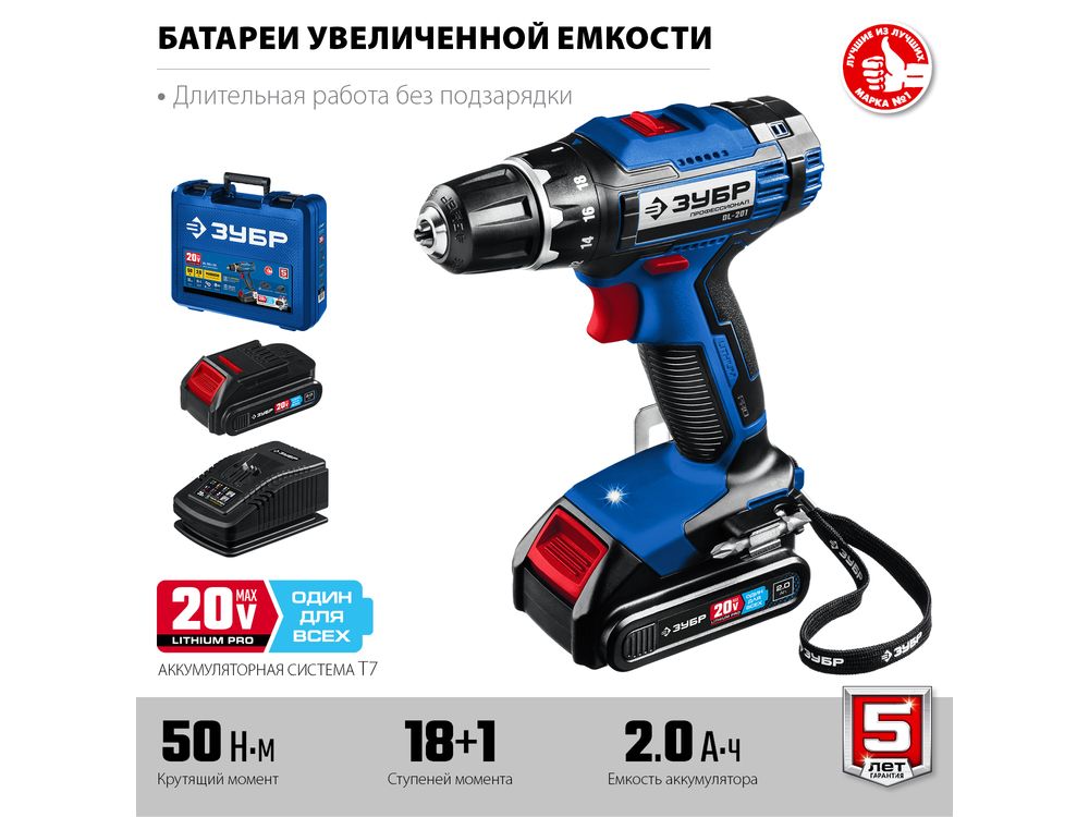 ЗУБР 20В, 2 АКБ (2Ач), в кейсе, дрель-шуруповерт, Профессионал. DL-201-22