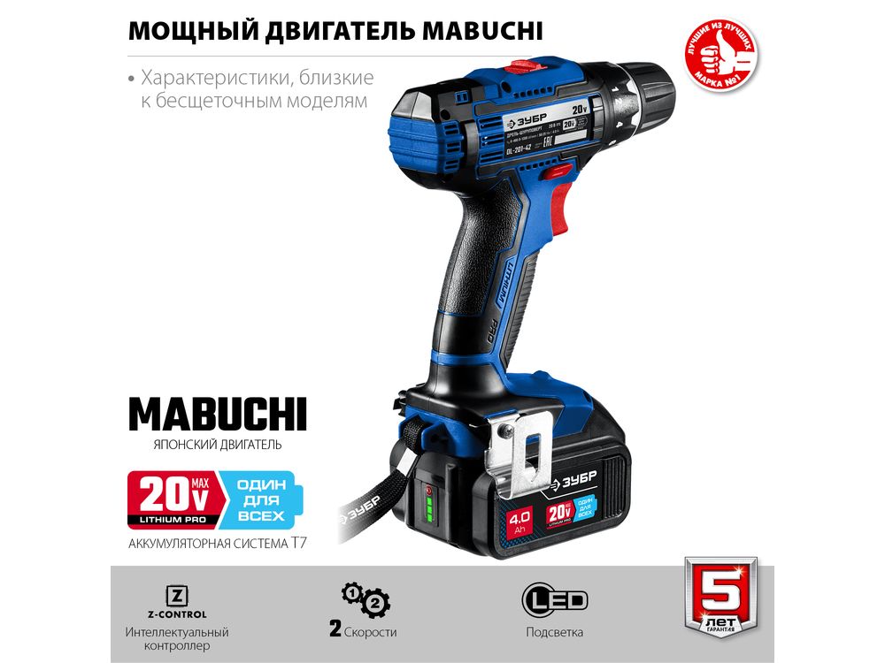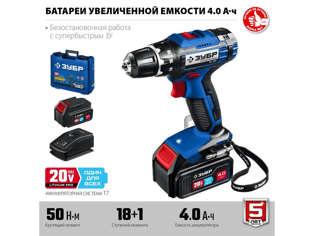 ЗУБР 20В, 2 АКБ (4Ач), в кейсе, дрель-шуруповерт, Профессионал. DL-201-42
