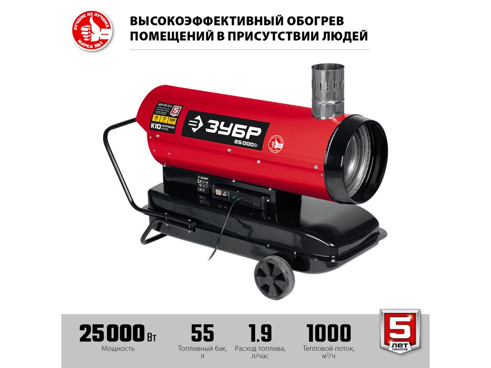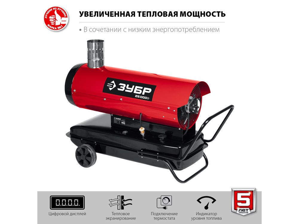 Высокоэффективный дизельный теплогенератор непрямого нагрева работающий на дизельном топливе для всех климатических условий. Благодаря конструкции, которая отводит продукты сгорания за пределы отапливаемого помещения, тепловая пушка оптимально подходит для сушки и прогрева как на строительных площадках, так и в жилых помещениях Надежный поджиг и эффективное горение гарантируют безотказную подачу тепла в любых условиях эксплуатации. Сделано в России ЗУБР - тепло всегда и везде
