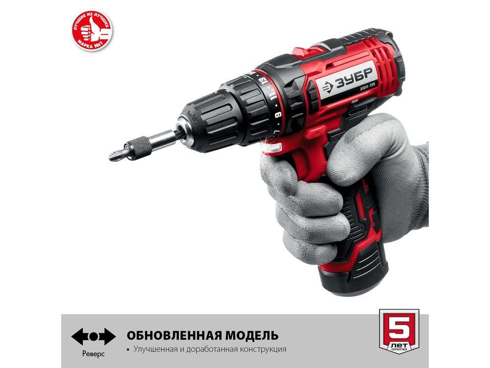 ЗУБР 12В, 1 АКБ (2Ач), в коробке, дрель-шуруповерт. ДШЛ-125-21
