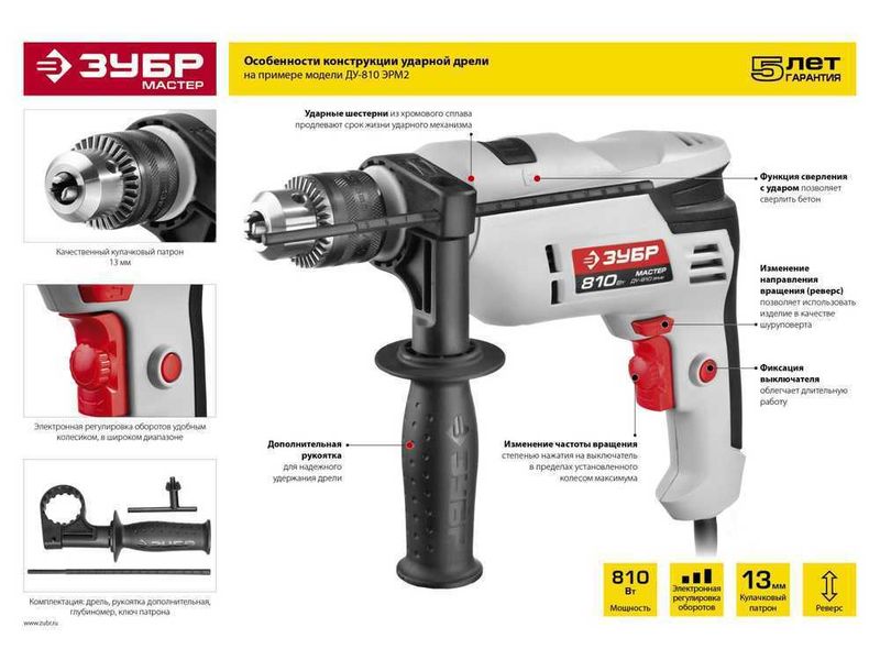 Дрель ЗУБР МАСТЕР ударная, патрон 13мм, реверс, сталь 10 мм / бетон 13 мм / дерево 20 мм, 810Вт