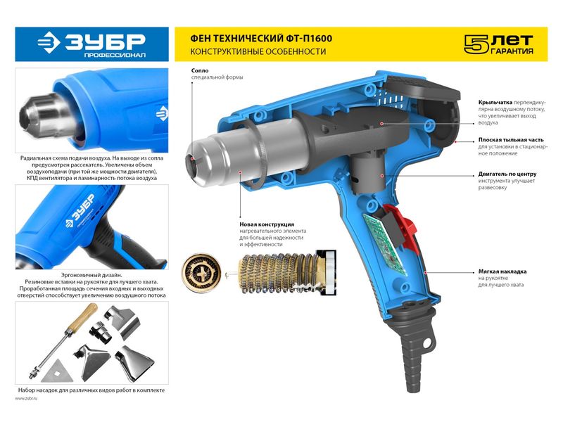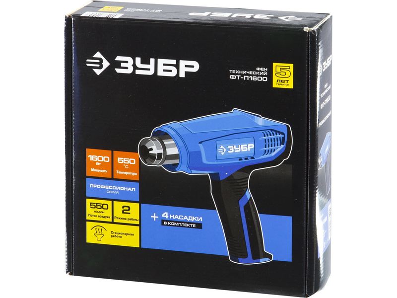 4 различные насадки в комплекте позволяют выполнять любую работу – от точечного нагрева до сушки больших площадей