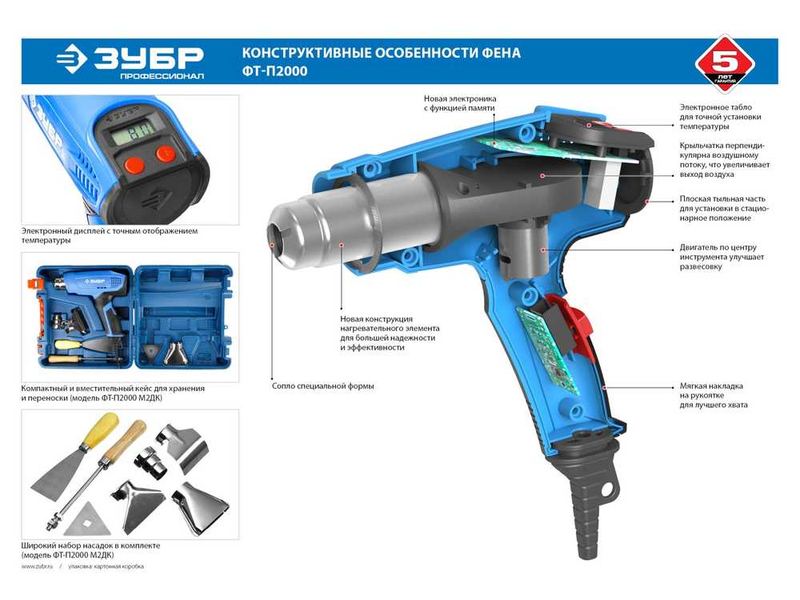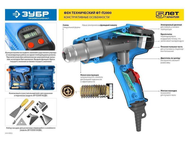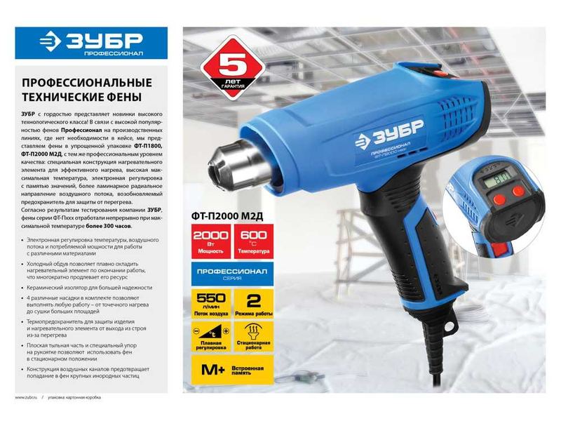 Модель профессионального уровня качества. Увеличенная толщина спиралей обеспечивает длительный срок службы нагревательного элемента. Точный контроль выходной температуры от 80 до 600 градусов и ламинарный воздушный поток гарантируют высокое качество выходного воздуха. Точный выбор температуры на ЖК-экране позволяет использовать изделие для широкого спектра работ. Кейс в комплекте способствует простому хранению и переноске