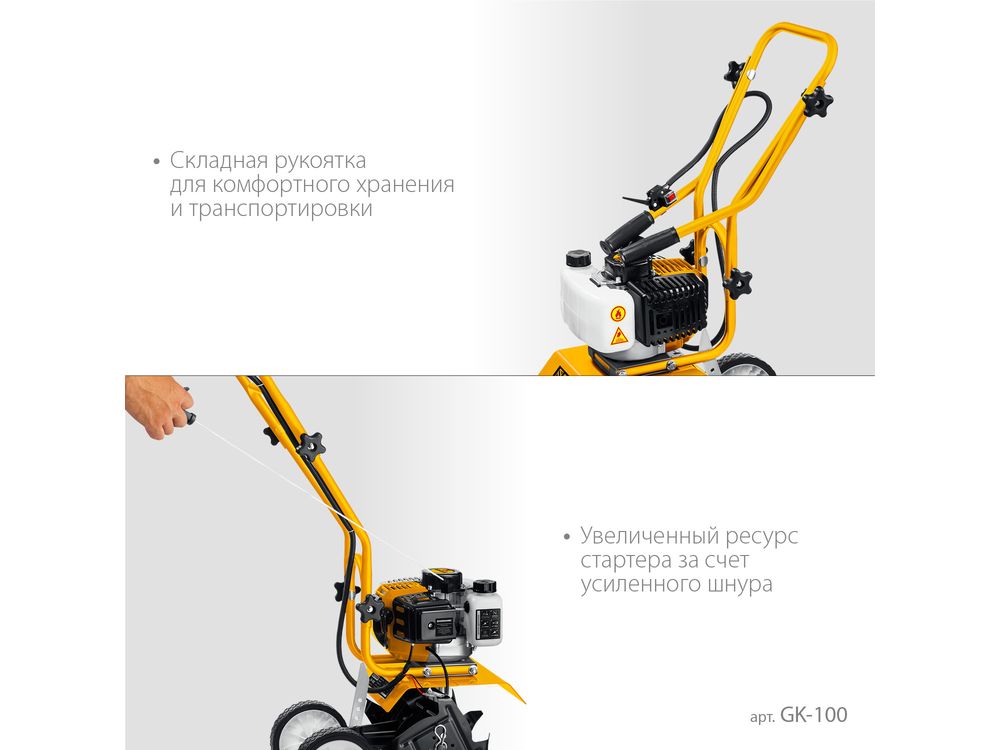 Складная рукоятка обеспечивает удобство хранения и транспортировки агрегата,