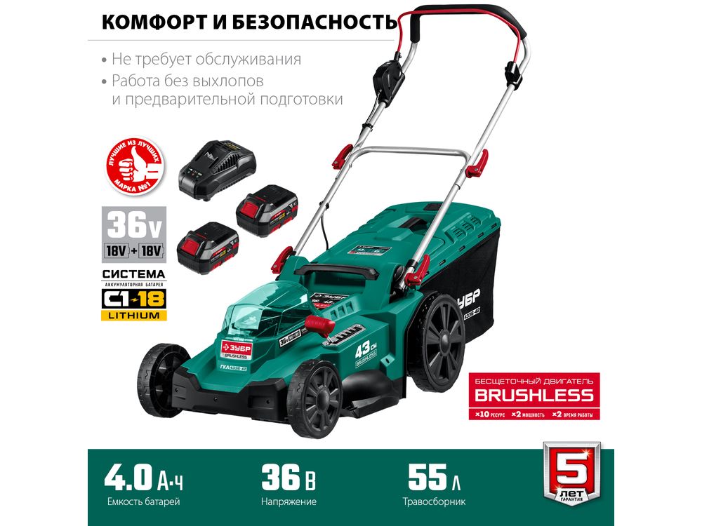 Мощный двигатель напряжением 36 В ускоряет процесс обработки, а увеличенная ширина 43 см кошения ускоряют работу