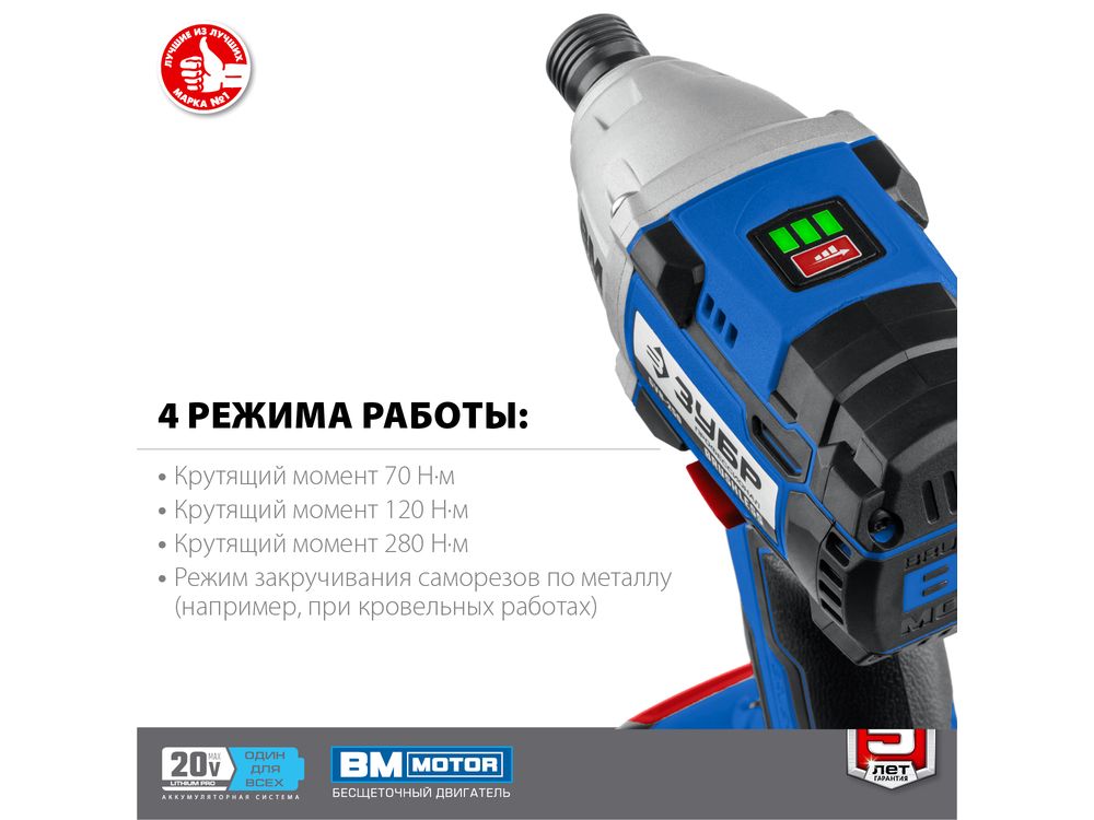 Профессиональный винтоверт оснащен BRUSHLESS двигателем, который обеспечивает высокие удельные характеристики и производительность благодаря двум батареям в комплекте. Точное управление параметрами двигателя позволяет ему постоянно работать в наиболее оптимальном режиме, регулировать крутящий момент, реализовывать дополнительные рабочие функции