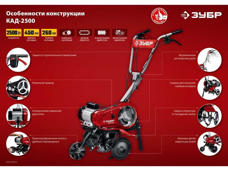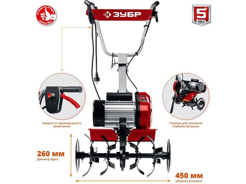 Мощный электрический культиватор с асинхронным двигателем 2500 Вт используется для рыхления и культивации почвы на небольшом садовом участке. Оснащен металлическими фрезами с шириной захвата 45см и обрабатывает почву на глубину до 26 см.