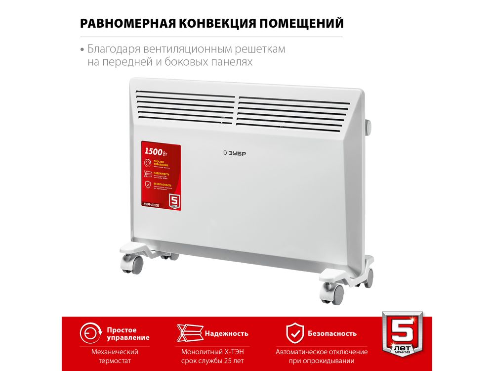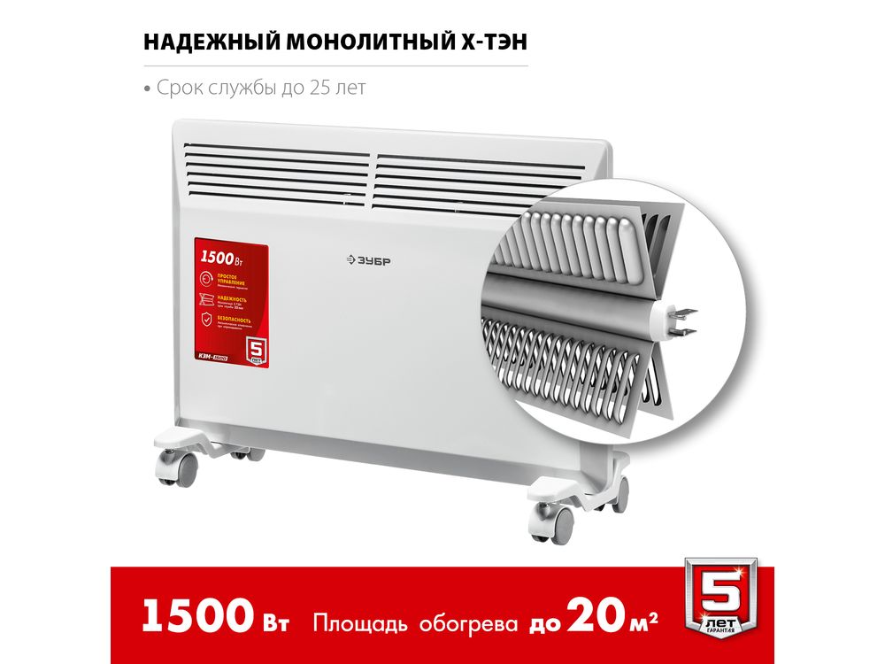 Электрический конвектор ЗУБР мощностью 1500 Вт - подойдет для обогрева любых домашних и офисных помещений, включая ванные комнаты, площадью до 20 м2. Сделано в России