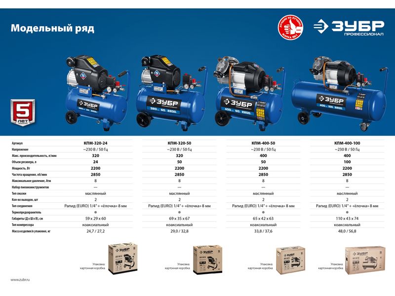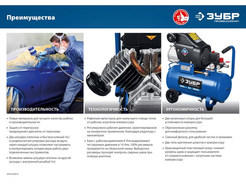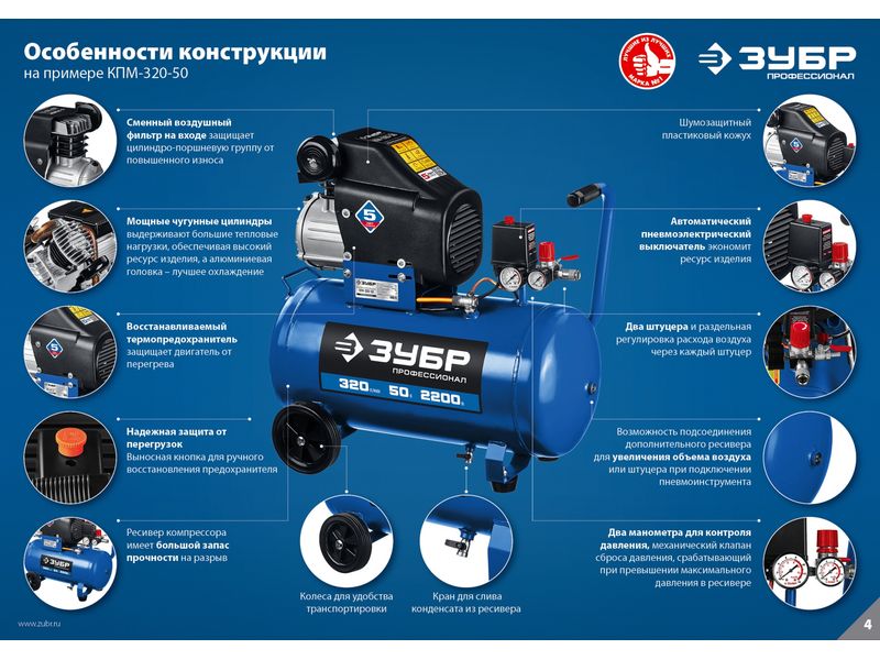 Грамотное сочетание новых технологий и проверенных временем конструкционных решений, которое найдет свое применение в мастерской, на производстве и в строительстве. Серия «Профессионал» отличается увеличенным ресурсомвозможность подключения двух инструментов, раздельно регулировать расход воздуха через каждый и автоматический режим работы изделия. Высокая производительность, возможность подключения двух инструментов, раздельная регулировка расхода воздуха через каждый позволяет подключать большой ассортимент пневмоинструмента. При правильной эксплуатации в соответствии с рекомендациями производителя ресурс данных компрессоров составит не менее 4000 часов*. * на основании результатов испытаний лаборатории компании АО «ЗУБР ОВК»